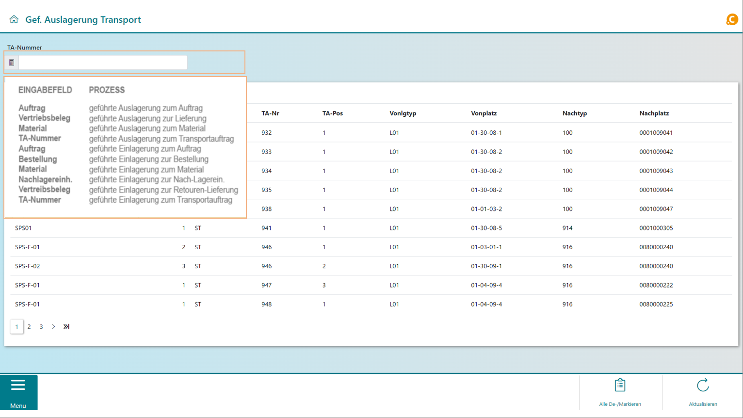 Das Eingabefeld im Beispiel dient zur Eingabe einer TA-Nummer. Bei Scan oder Eingabe einer TA-Nummer (4) werden alle Einträge aus dem Vorrat selektiert, die diese TA-Nummer haben . Als Eingabefelder können alle Felder gewählt werden, die sich im Kopf bzw. in der Position des Transportauftrags befinden.
