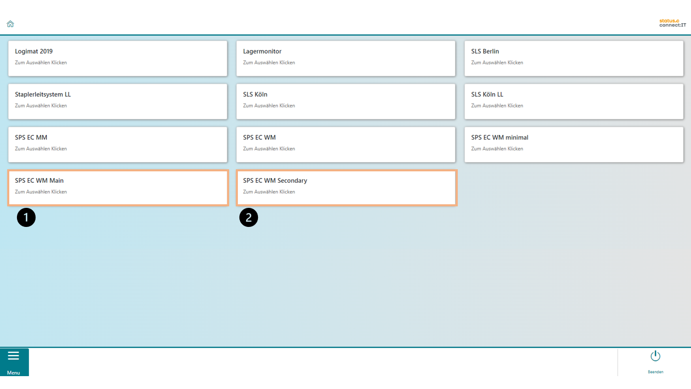 Die Main und Secondary Lifte werden in der Arbeitsplatzauswahl angezeigt. Durch Klick oder Touch auf den jeweiligen Lift - Main (1), Secondary (2) - startet die Anwendung des entsprechenden Lifts.