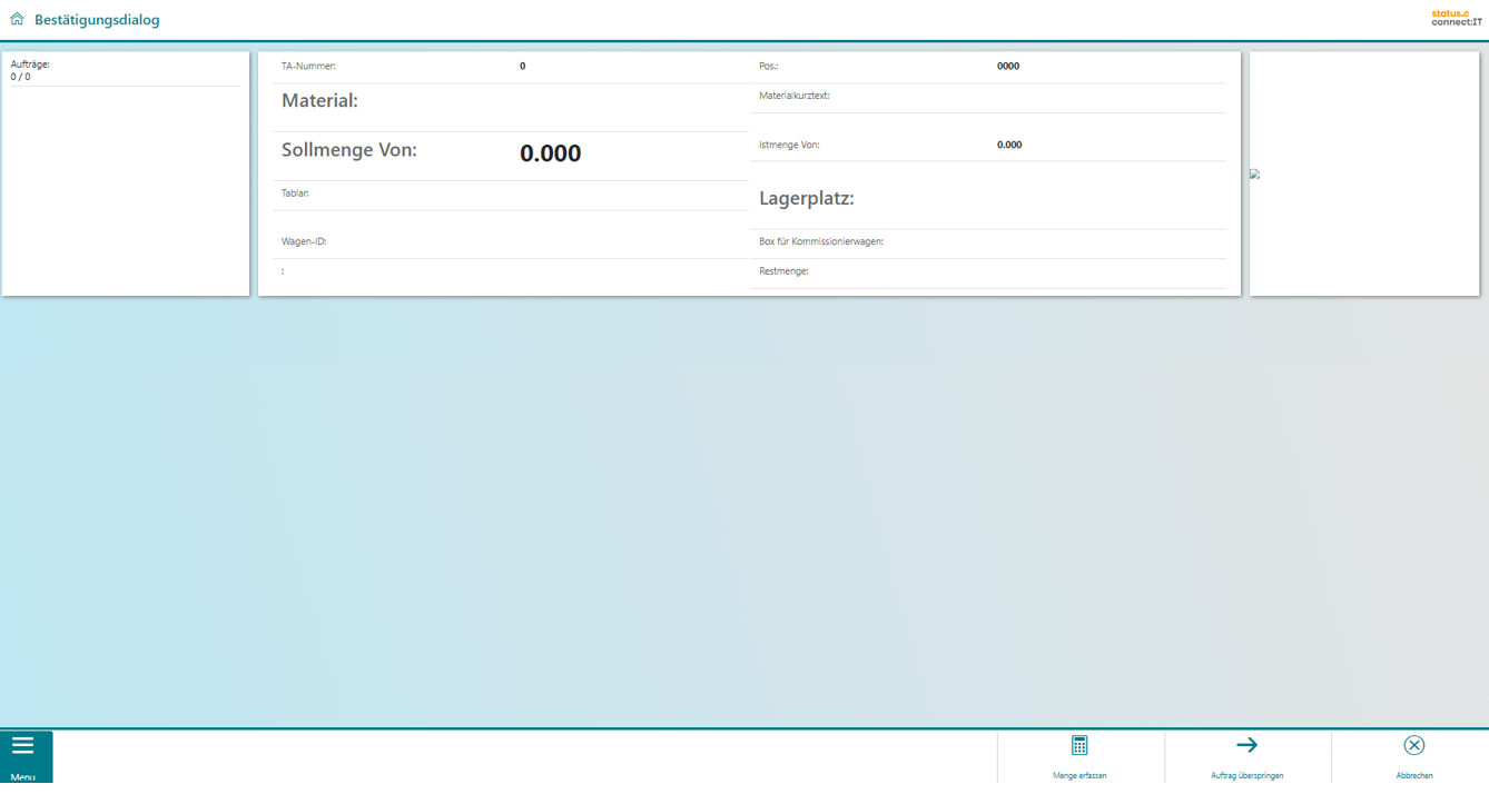 | Der "Bestätigen"-Button quittiert den Fahrauftrag und damit den dazugehörigen Transportauftrag/Transportauftragsposition. Der nächste Auftrag wird angefahren. Sind keine weiteren Aufträge ausgewählt, wechselt das Bild zurück zum Arbeitsvorrat. |