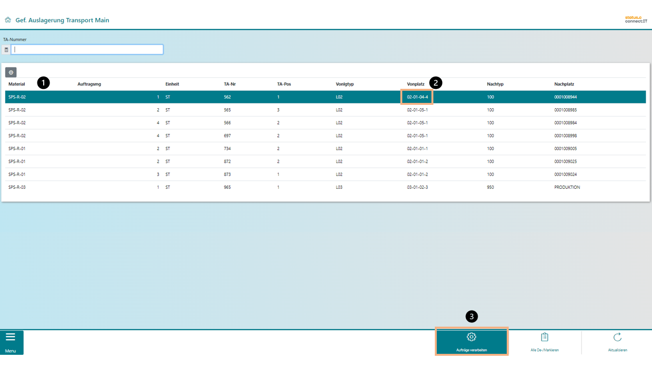 Unter der Funktion Geführte Auslagerung Main werden im Main Lift alle Fahraufträge im Arbeitsvorrat (1) dargestellt, die sowohl den Main Lift, als auch den Secondary Lift betreffen. Am "Vonlagertyp" (2) kann man erkennen, ob es sich um eine Auslagerung vom Main oder vom Secondary Lift handelt. Hier im Beispiel ist dem Secondary Lift der Lagertyp L03 zugewiesen. Der markierte Fahrauftrag soll das Material also vom Secondary Lift auslagern. Durch Aufträge verarbeiten (3) wird der Fahrauftrag an den Secondary Lift geschickt. Für den Main Lift ist der Auftrag ab hier erledigt.