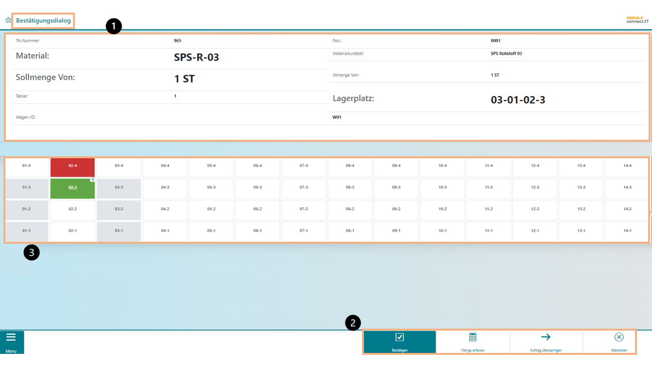 Der Secondary Lift reagiert auf den zugewiesenen Fahrauftrag und fährt das betreffende Tablar an die Entnahmeöffnung. Im Bestätigungsdialog ist nun das Tablar, aus dem ausgelagert werden soll, zu sehen. Im Hauptfeld sind zum einen die Auftragsdaten abgebildet (1) zum anderen ist das entsprechende Tablar visualisiert (3). Mithilfe der Buttons in der Navigationszeile (2) kann der Prozess entsprechend navigiert werden. Durch Bestätigen wird die Entnahme bestätigt und der Transportauftrag quittiert.