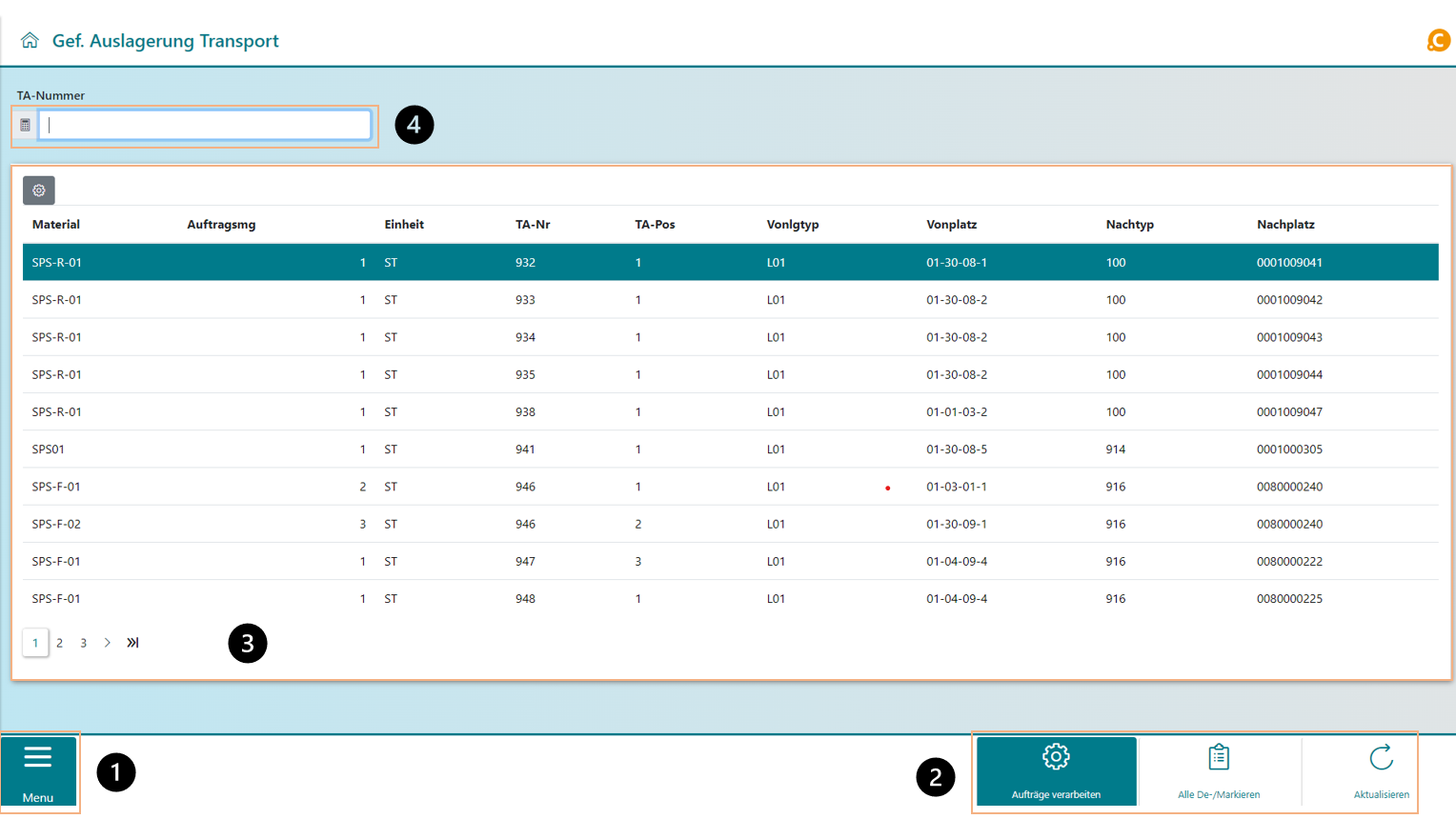 Das Eingabefeld im Beispiel dient zur Eingabe einer TA-Nummer. Bei Scan oder Eingabe einer TA-Nummer (4) werden alle Einträge aus dem Vorrat selektiert, die diese TA-Nummer haben . Als Eingabefelder können alle Felder gewählt werden, die sich im Kopf bzw. in der Position des Transportauftrags befinden.