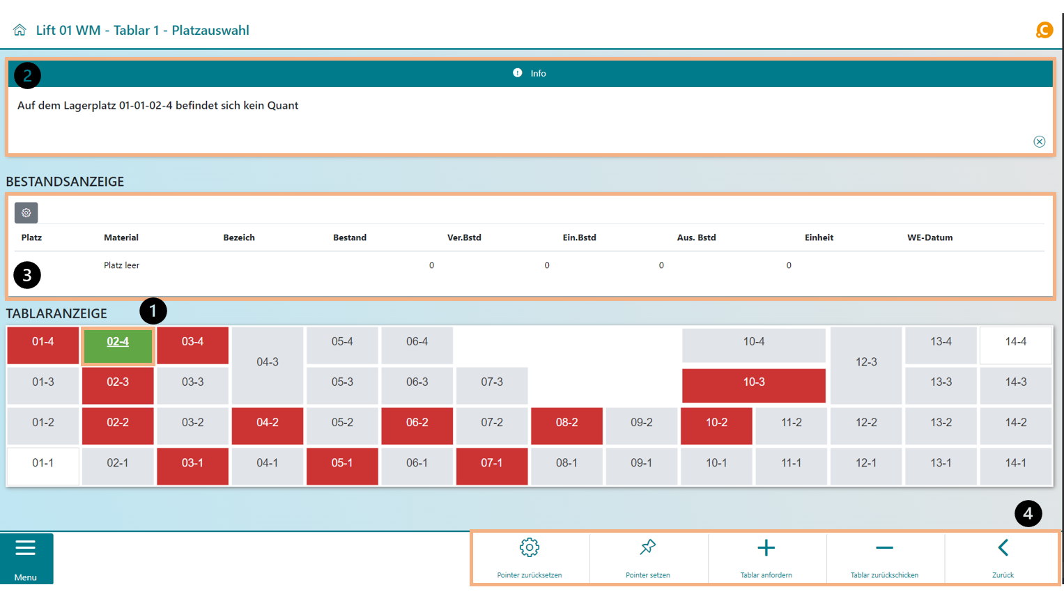 Wählt man in der Tablaranzeige einen Lagerplatz aus, wird dieser farblich hervorgehoben (1). Im Beispiel erscheint eine Informations-Box, die darüber informiert, dass der gewählte Lagerplatz leer ist (2). Dementsprechend wird in der sich darunter befindenden Bestandsanzeige darüber informiert, dass der Platz leer ist (3). Die Navigationsleiste (4) ermöglicht es, sofern die Funktion und ein Gerät vorhanden ist, den Laserpointer zu aktivieren und einen Lagerplatz damit hervorzuheben. Außerdem kann in dieser Situation das Tablar angefordert oder zurückgefahren werden. Eine Rückkehr in das vorherige Bild ist ebenfalls möglich.