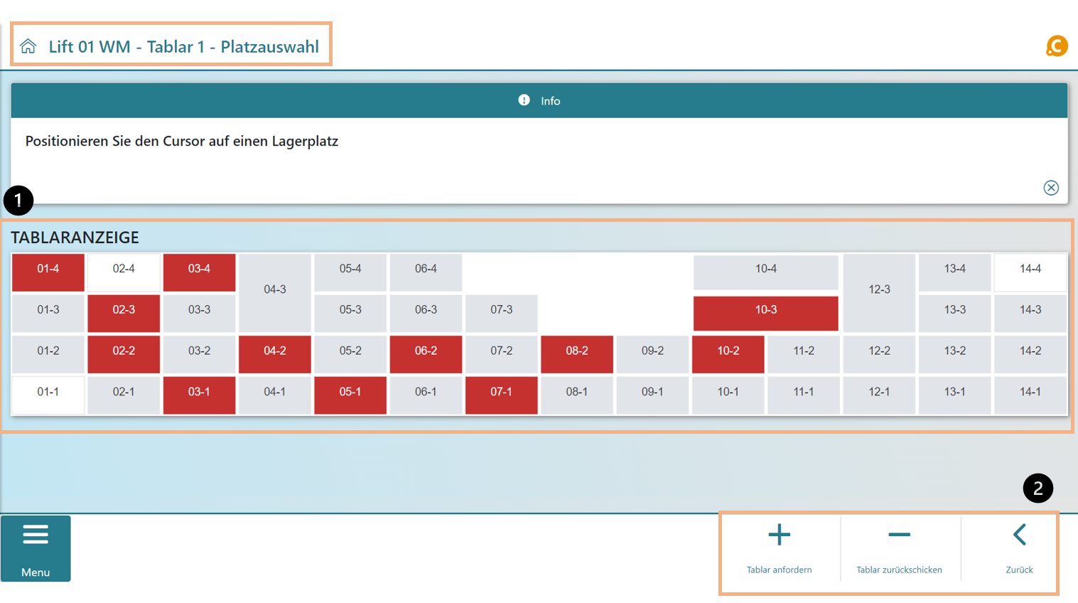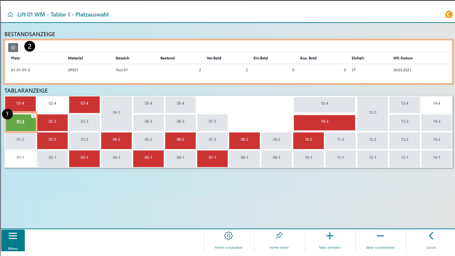 Sobald ein Tablar ausgewählt wurde, wird es in der Tablaranzeige (1) unten angezeigt. Des Weiteren werden die Buttons zur Tablarsteuerung (2) eingeblendet.