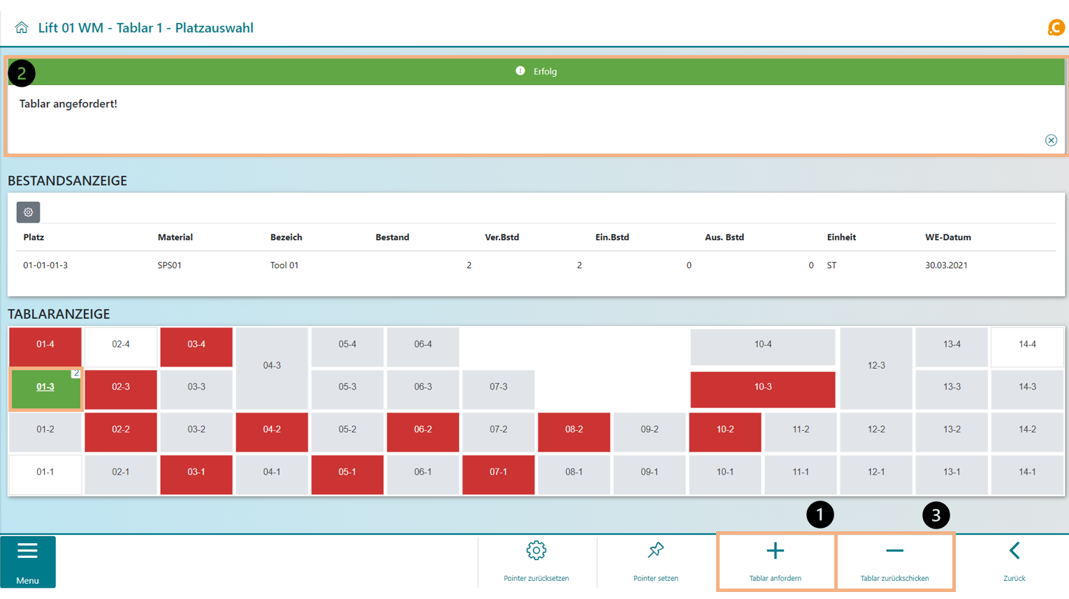 Wird ein Tablar angefordert über den Button Tablar anfordern (1), erscheint eine Erfolgsmeldung (2). Zudem wird bei der Anforderung eine Erfolgsmeldung über den kompletten Bildschirm wiedergegeben. Wenn ein Lagerplatz ausgewählt wurde, wird auch der Button Pointer setzen eingeblendet. Hiermit wird der Pointer auf die Position des selektierten Lagerplatzes gefahren. Diese Funktion ist auch möglich, ohne vorher ein Tablar angefordert zu haben. Über den Button Tablar zurückfahren (3) kann das angefordert Tablar wieder zurückgeschickt werden.