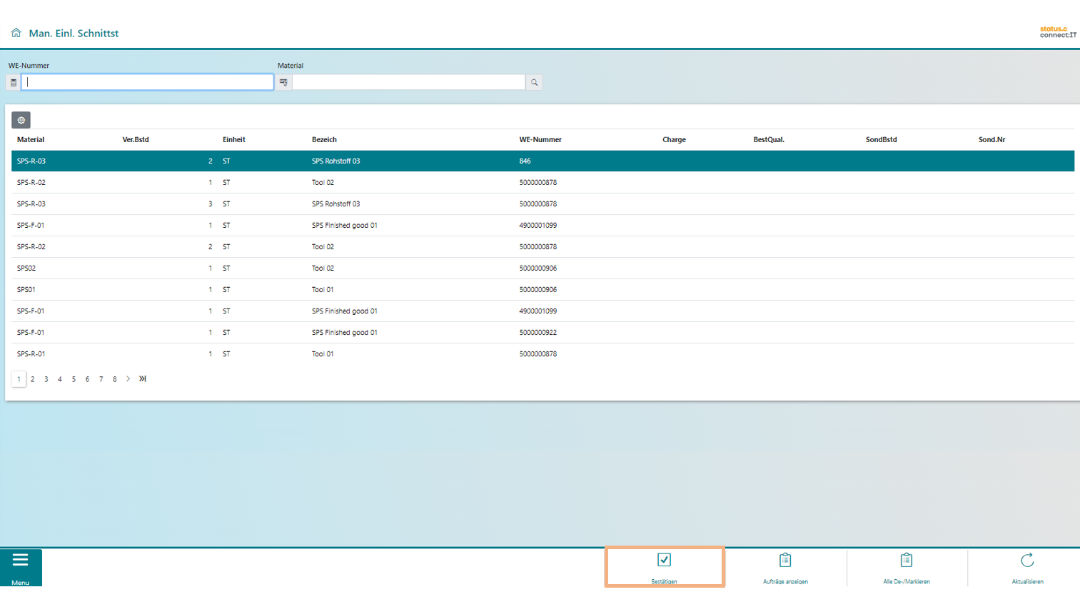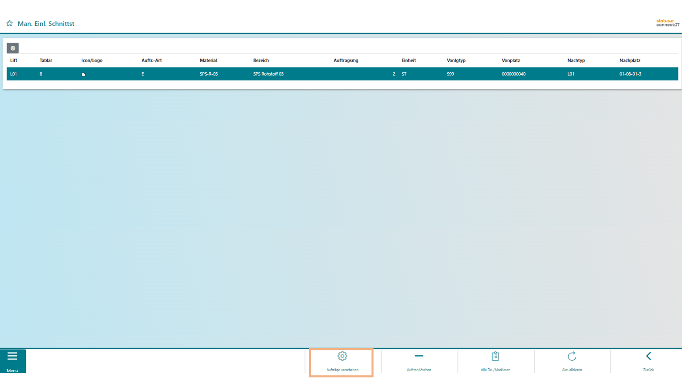 Im Einstiegsbild sieht der Anwender die Materialien, welche sich auf der Schnittstelle befinden. Über Auswahl einer Zeile oder mehrerer Zeilen gelangt er in den Palettierungsdialog. Falls mehrere Einträge gewählt sind, werden die Materialien in der Reihenfolge abgearbeitet, bevor ein Auftrag verarbeitet werden kann.