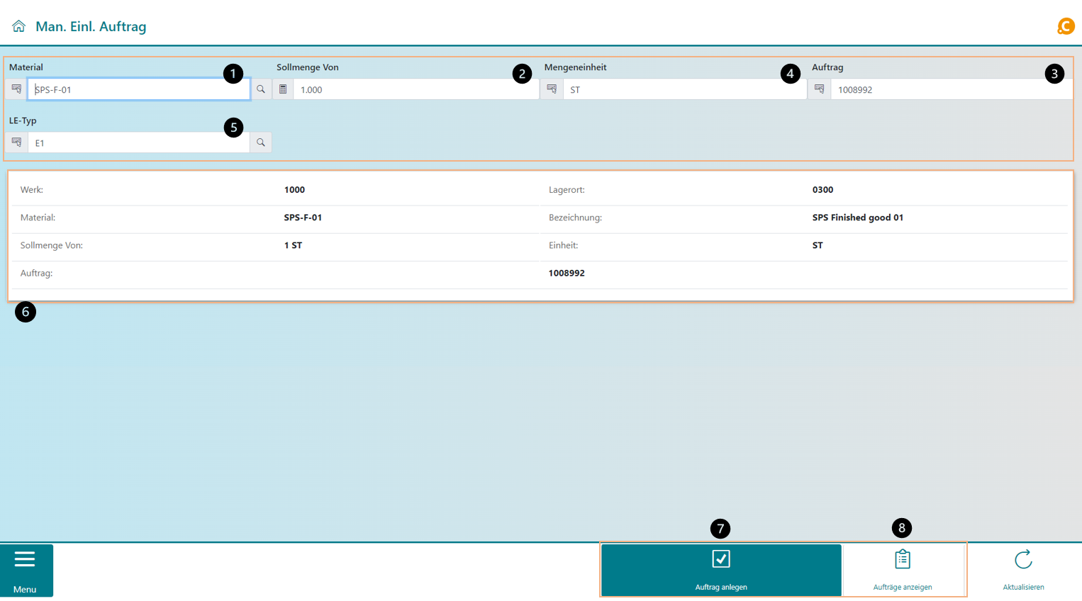 Im Hauptfenster werden vier Eingabefelder angezeigt. Um einen Auftrag anzulegen, müssen Material (1), Sollmenge (2), Auftragsnummer (3) eingegeben werden. Die Mengeneinheit (4) wird aus dem Materialstamm übernommen. Zusätzlich wird der Lagereinheitentyp (5) (LE-Typ) eingegeben. Sofern die eingegebenen Daten korrekt sind, werden zusätzliche Informationen in der Bildmitte angezeigt (6) und der Button Auftrag anlegen wird eingeblendet (7). Bereits erstellte Aufträge lassen sich über den Button Aufträge anzeigen (8) einsehen und verarbeiten.