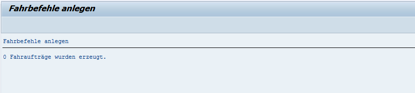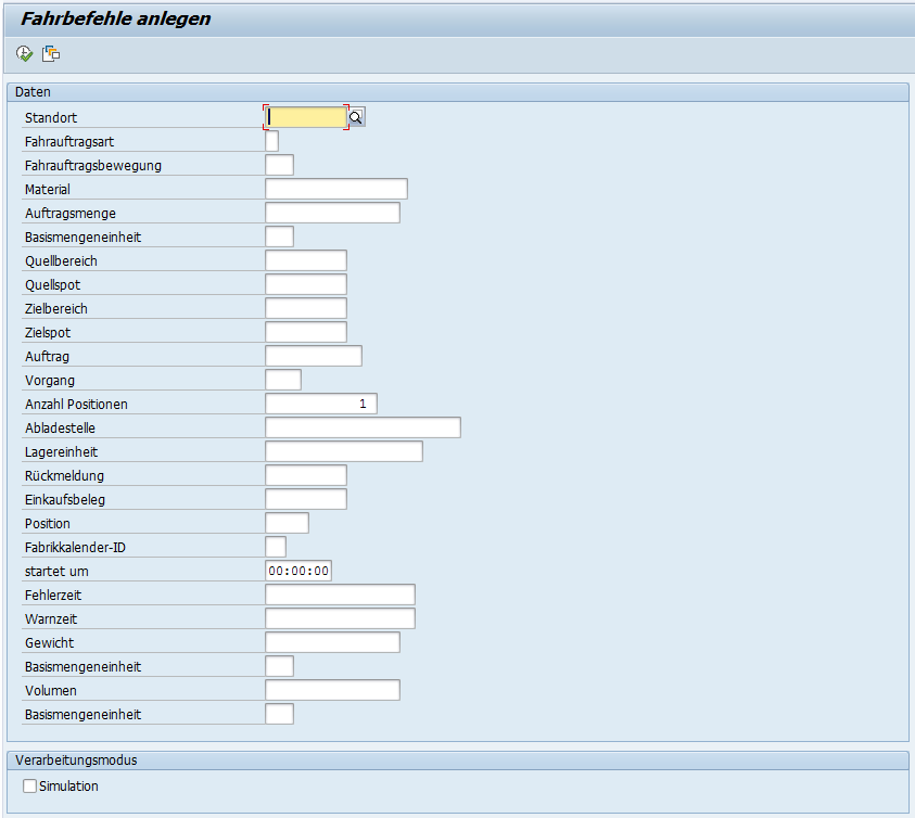| Fahrauftragsart | ja | Die Fahrauftragsart des Fahrauftrages, welchen Sie anlegen wollen, z.B. 'E' für Einlagerung. |