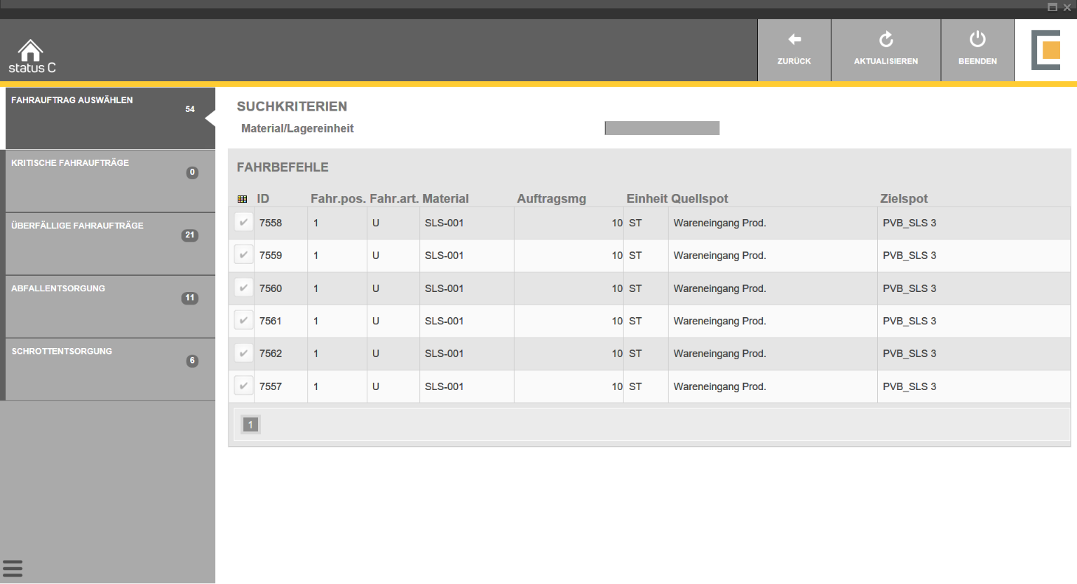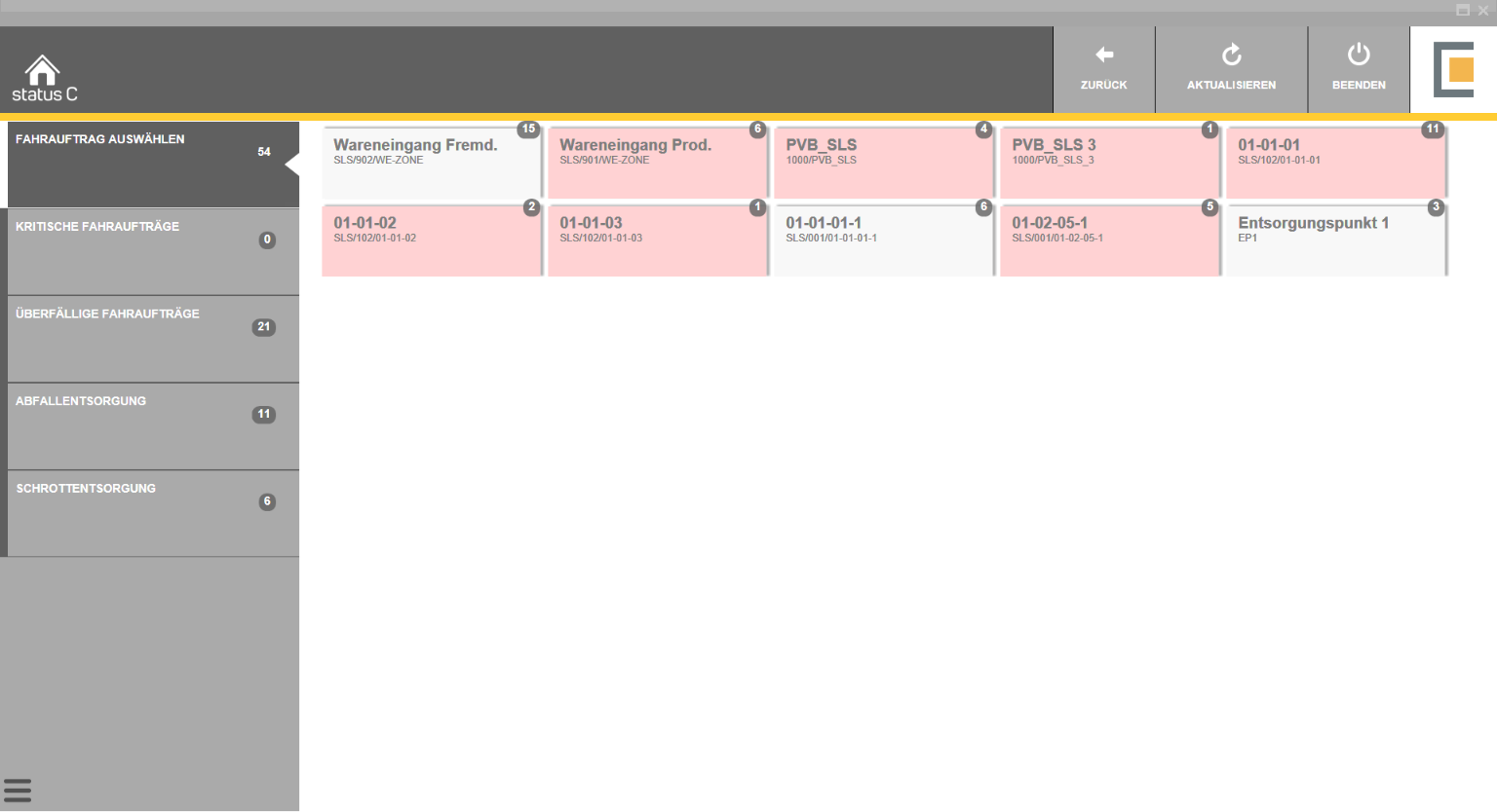 Standardmäßig besteht der Prozess aus zwei Bildern - der Kachelansicht sowie der folgenden Listansicht. In der Kachelansicht werden die Aufträge nach Arbeitsbereichen zusammengefasst. Hier werden alle Aufträge angezeigt, die mit den hinterlegten Daten gefunden werden. Rote Kacheln bedeuten, dass der Vorrat mindestens einen überfälligen Fahrauftrag enthält. Diese sollten Sie vorrangig abarbeiten. Gelbe Kacheln bedeuten, dass der Vorrat mindestens einen kritischen Fahrauftrag enthält.