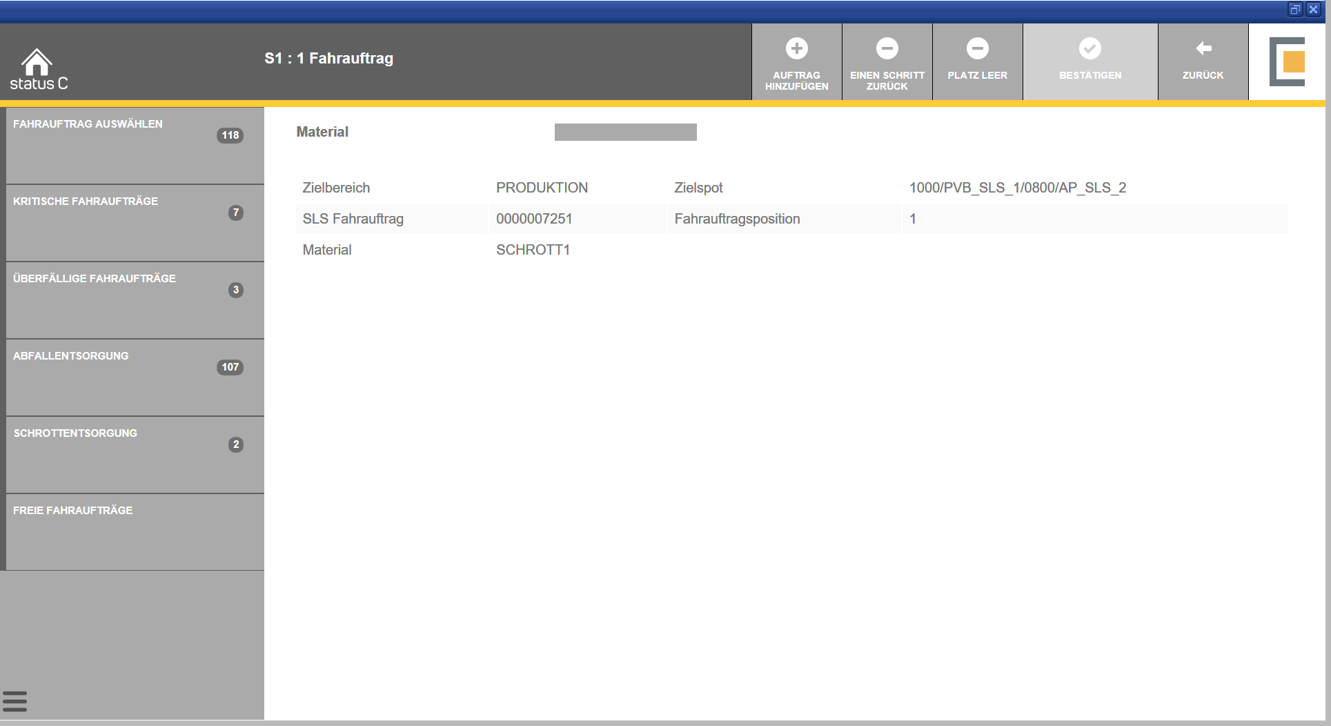Analog zum Aufnehmen ist auch beim Abgeben des Materials eine Verifizierung nötig. Bei erfolgter Verifizierung kann der Fahrauftrag bestätigt werden und erscheint nicht mehr in dem Auftragsvorrat.
