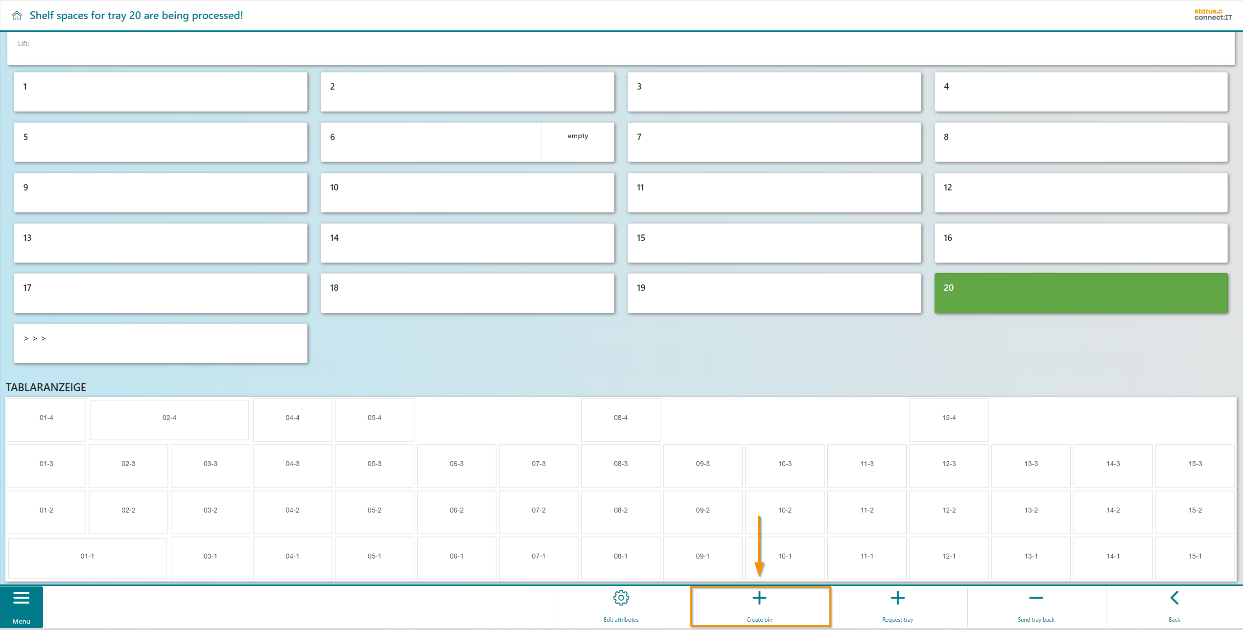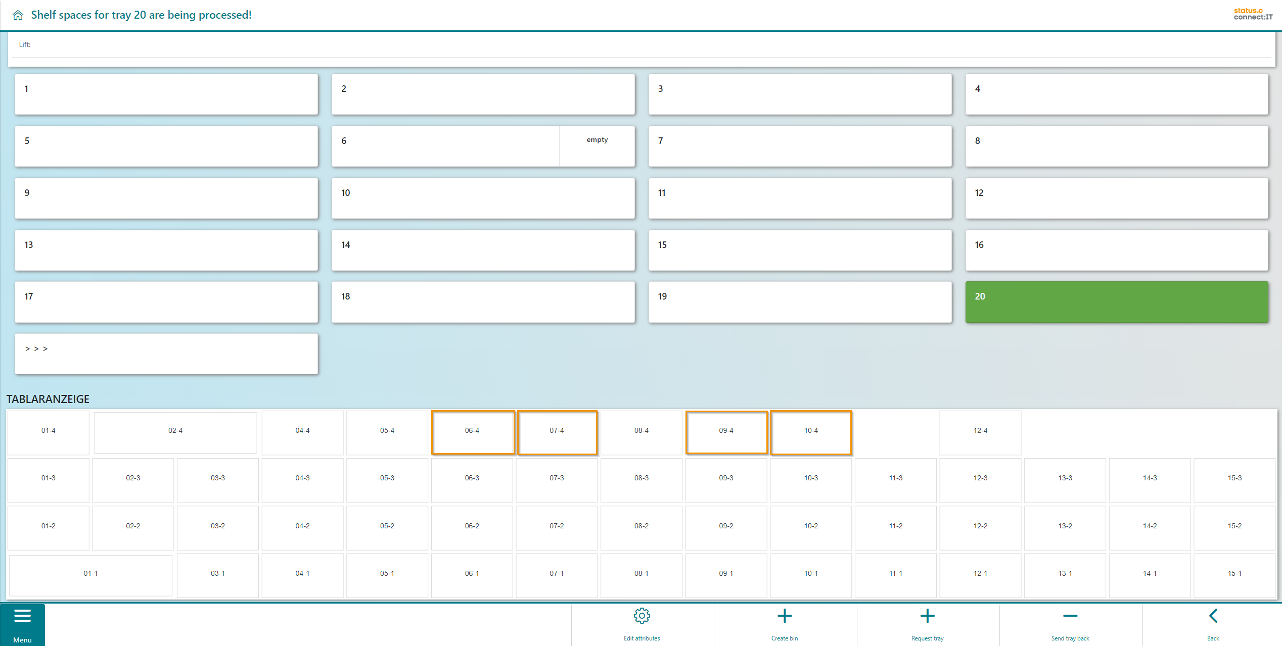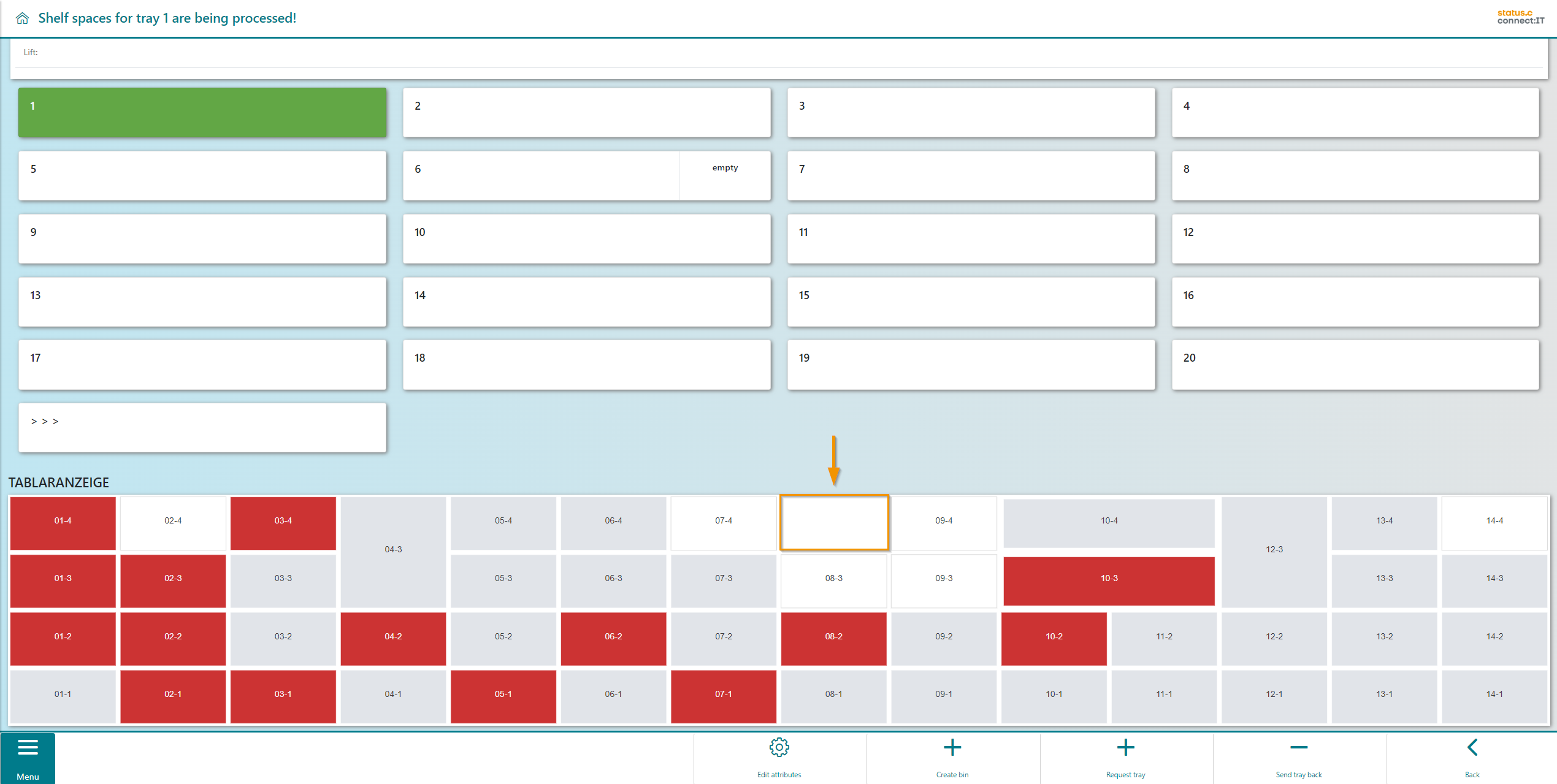 With the "Edit Tray" application, trays can be requested manually and the layout of the trays can then be edited. It is possible to delete existing bins as well as creating new bins. With this process, for example multiple small bins can be transformed into a new, big one. This also works the other way round, one big bin can be divided into multiple small bins.