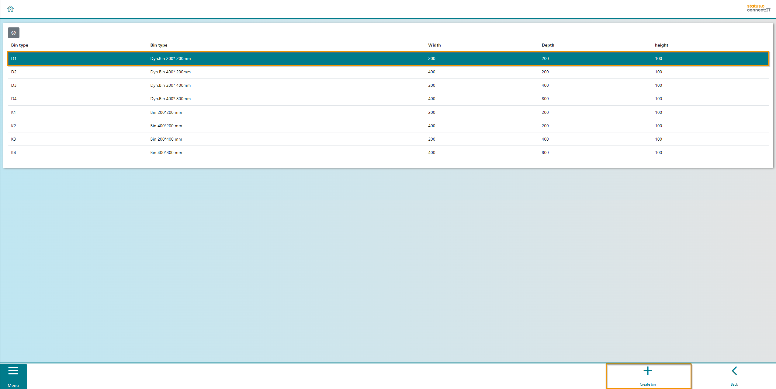 If no bin is selected and at least one bin was deleted, the user can create one or multiple new bins in the empty area. Clicking on the "Create bin" button leads to the selection of the storage unit type for the new bin.