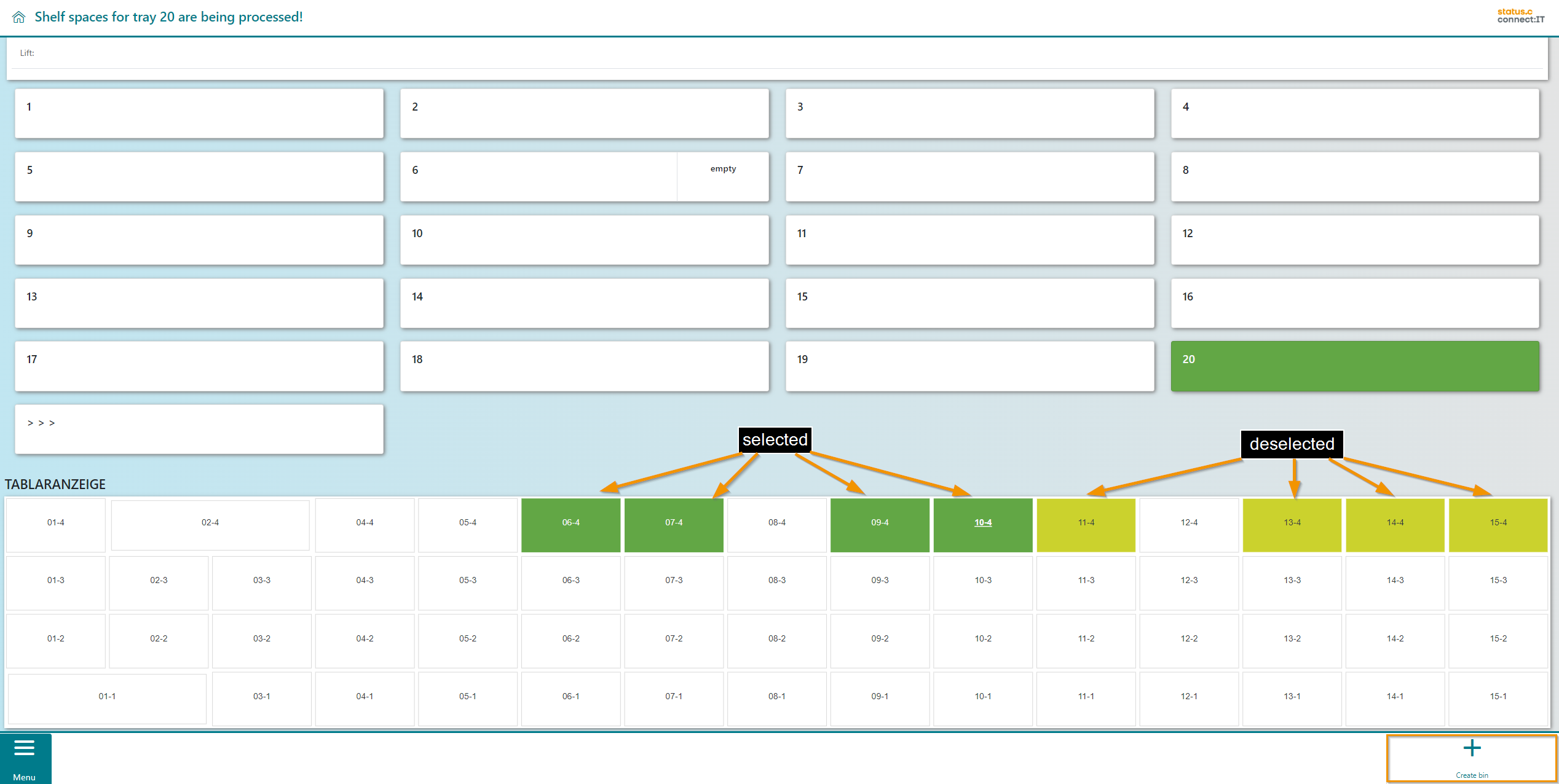 After selecting "Create bin" in the previous screen, the tray visualization opens. Every empty area that can be filled with the chosen storage unit type will be selected and marked in green. Clicking on a green-marked bin will deselect it and the color changes to a lime green. With the final input of the "Create bin" button, every selected bin will be created.
