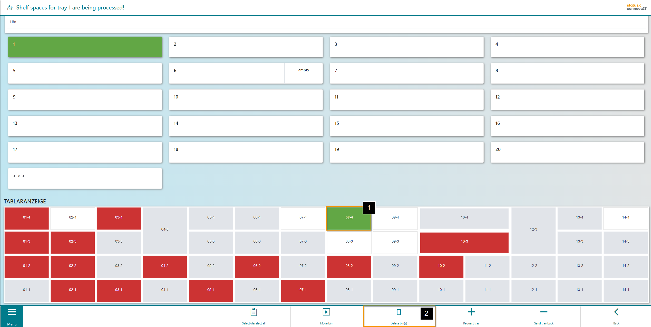 Touch or click on the bins in the tray visualization to select them (1). If at least one tray is selected (highlighted in green), the button "delete bin(s)" appears (2). In the example, a bin is selected and deleted.