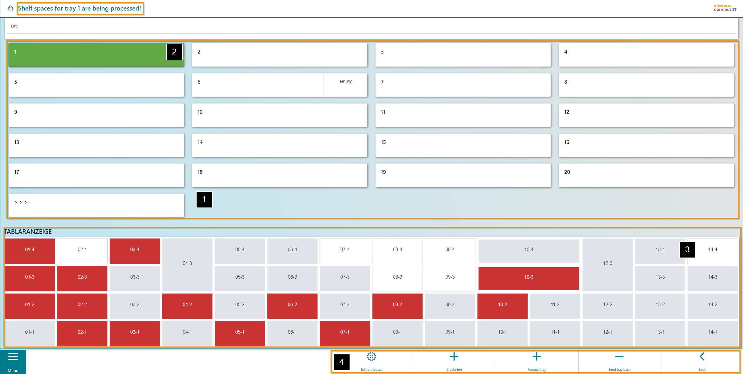 Select the tray to be edited. The individual trays are visualized in the middle (1). In the example, tray 1 is selected, this is highlighted by the green color (2). The selected tray is displayed in detail in the lower section of the screen (3). The bins are colored, red bins are blocked by the inventory, grey bins contain items and white bins are empty. The options for editing and controlling the tray are displayed in the navigation bar (4). In addition, a message is displayed in the header for which tray the spaces are currently being edited.