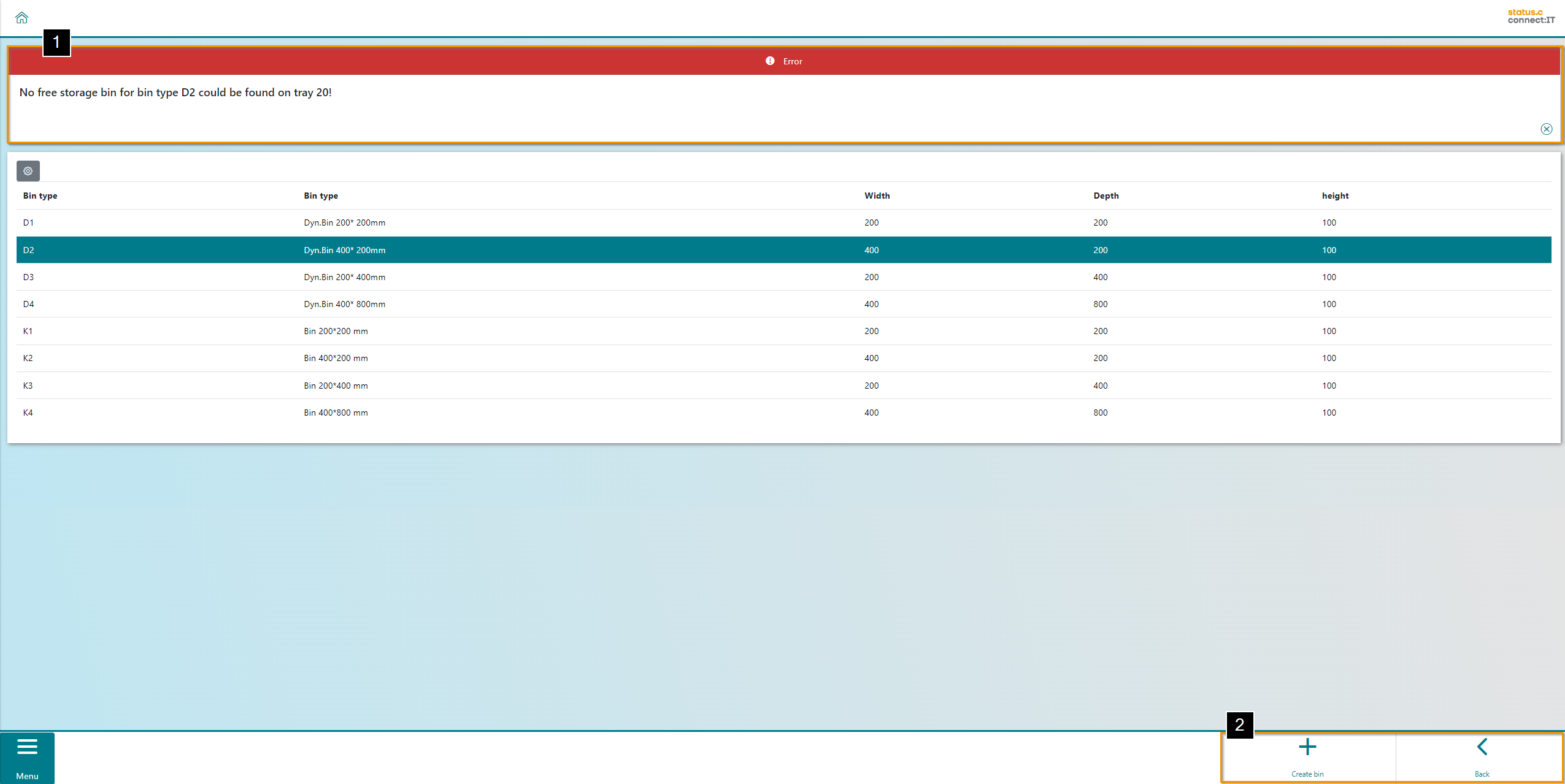 In the center, the storage unit types, which can be created, are displayed. The storage unit types have different dimensions. The selection of a type is done by selecting the respective line in the table (1). Once a type is selected, the bin can be created by using the "Create bin" button.(2) This process can be carried out several times, until the empty areas on the tray are filled with new bins.