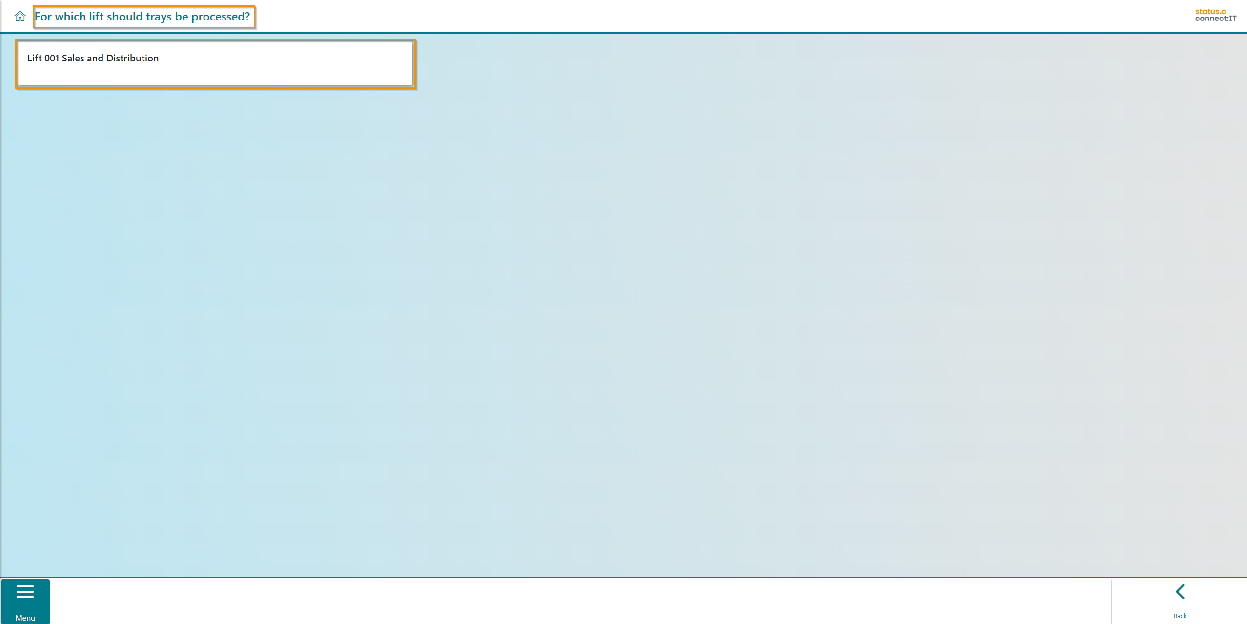 At the beginning, select a lift where the tray for processing is located. In this example, only one lift is available. The header serves as a reminder of the needed input.