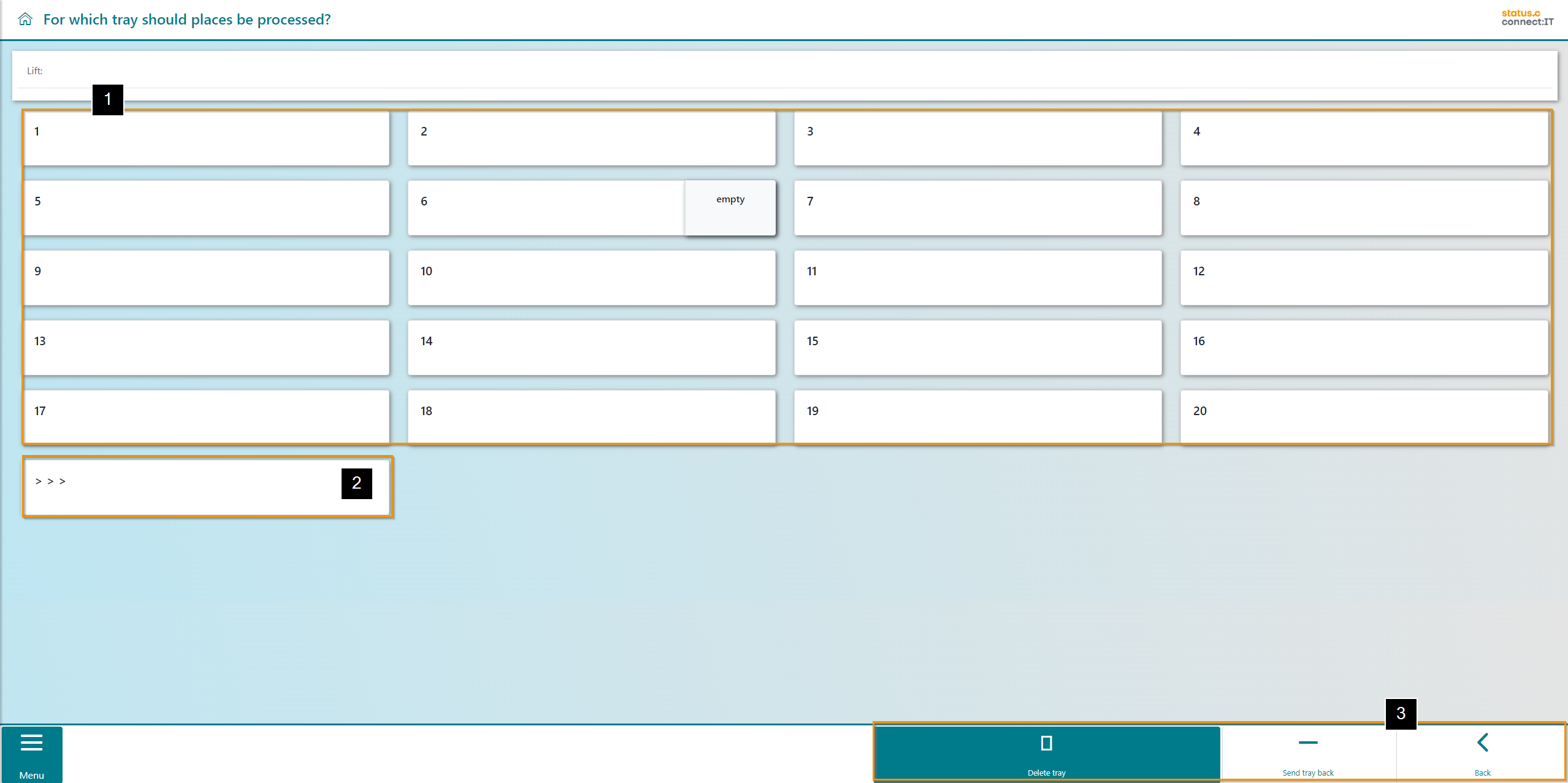 In this view, you can see which trays are available for modification (1). You can use the arrows (2) to jump to the next page of trays. It is also possible to send the tray back, delete a tray or return to the lift selection (3).