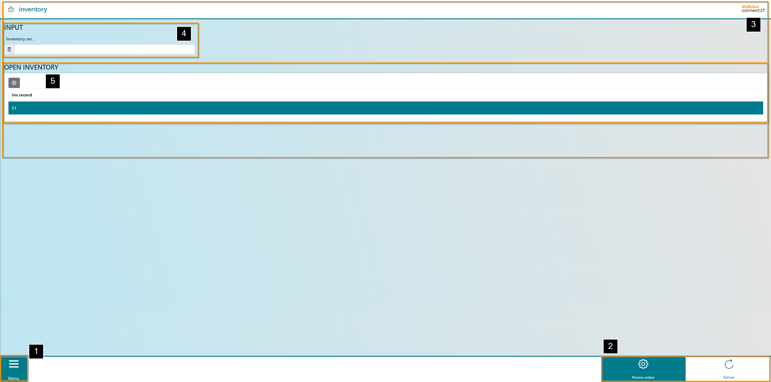 In the example of the storage bin inventory, the main window only consists of the input field in which inventory records can be entered (4). The inventory records for the open inventories are also shown (5).