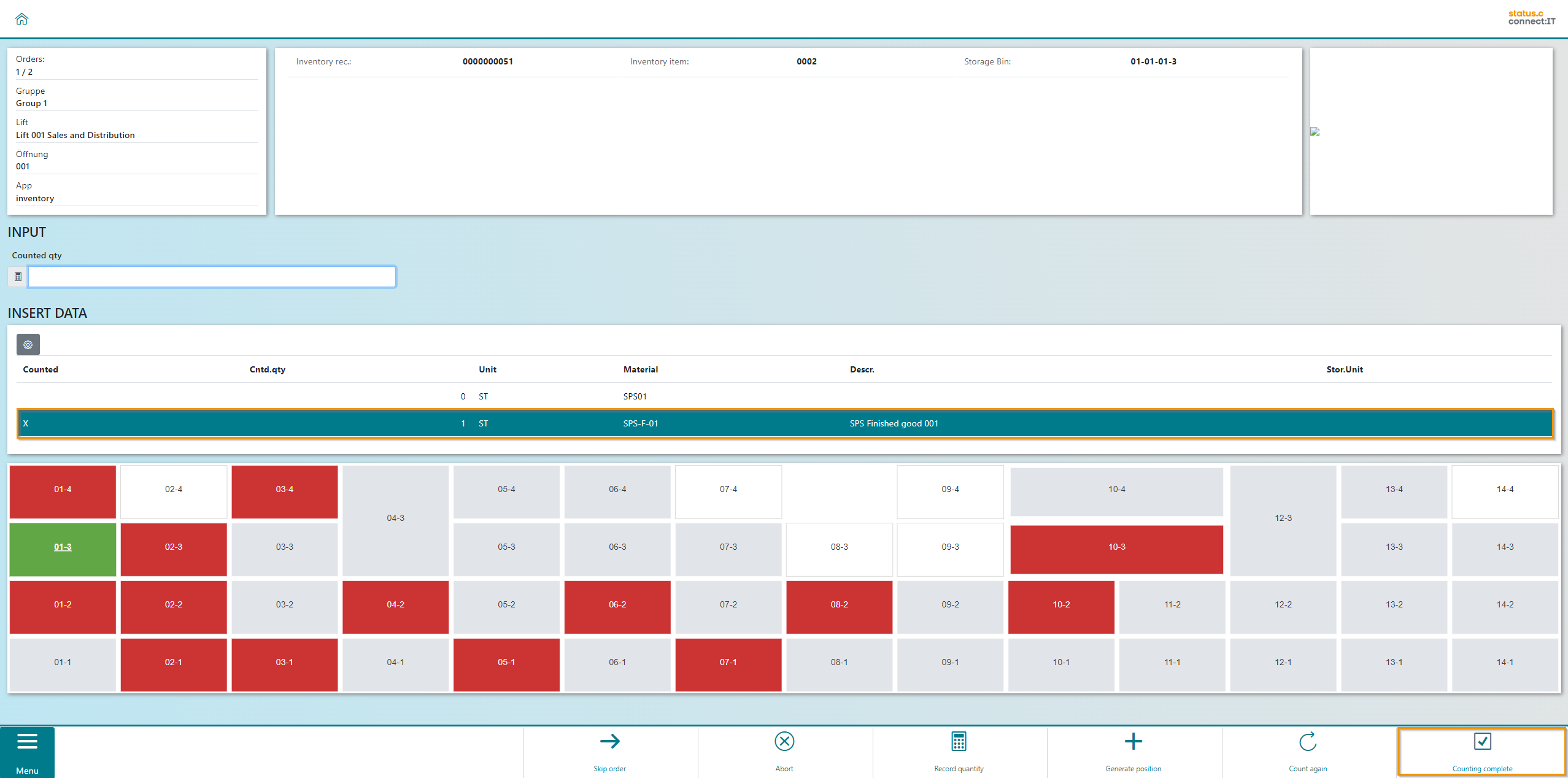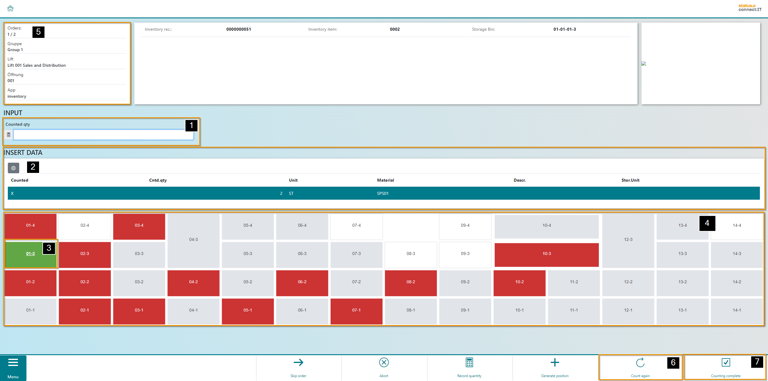 By entering and confirming a valid inventory document number into the respective input field, a driving command is sent to the storage system, carried out, and the user is directed to the confirmation dialog. The counted quantity can now be entered here using a corresponding input field and changed at any time (1) The recorded data is listed under the counted quantity input field and divided into counted quantity, material and description (2). The bin (3), where the stock should be counted, is highlighted on the tray visualization (4). A counter in the top left corner keeps track of how many orders still need to be processed (5). In the navigation bar the user has the chance to repeat the counting by pressing the corresponding button (6). When the counting is complete, the process can be finished (7).