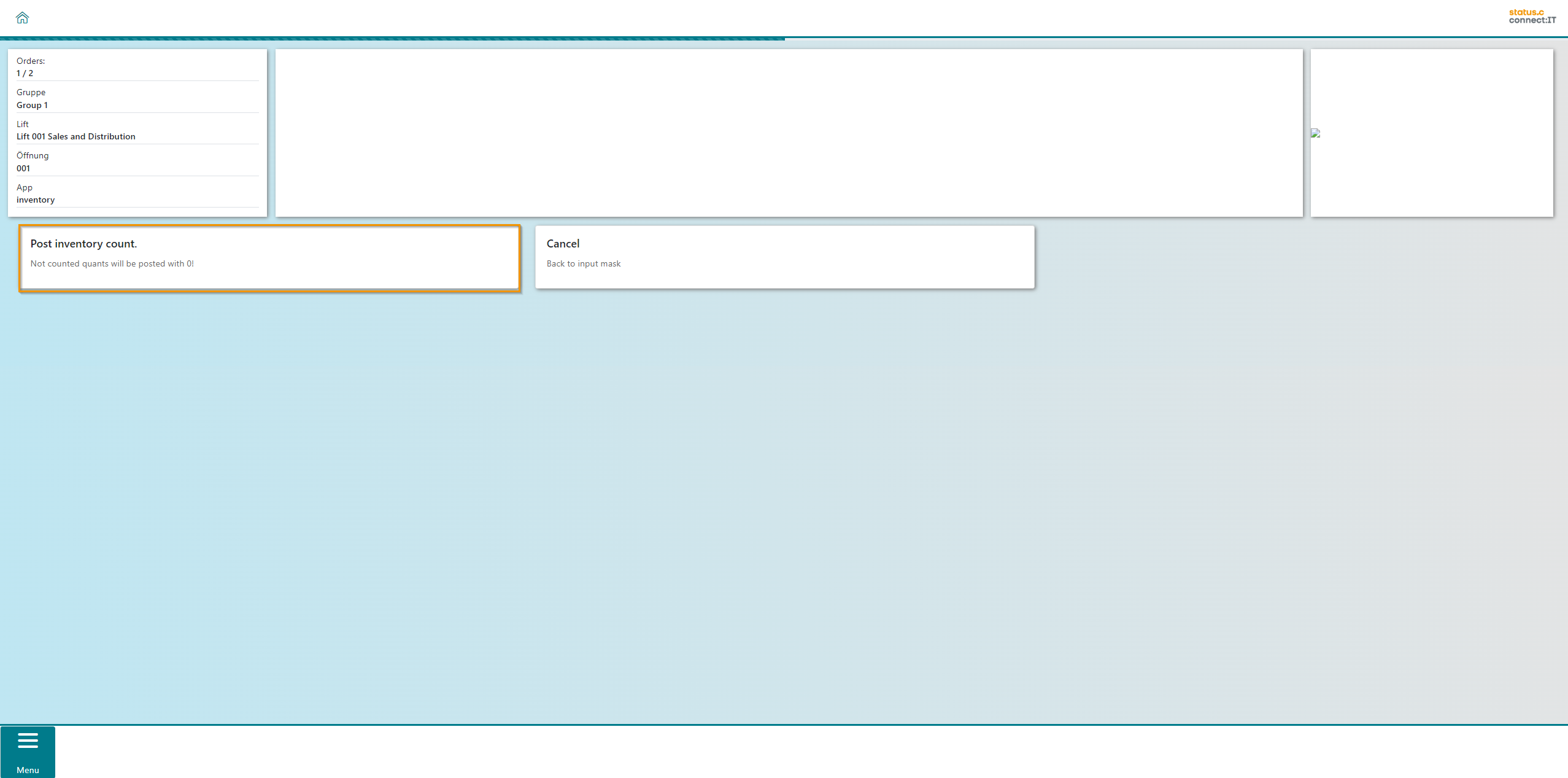 If further inventory orders are waiting, the user is directed to this screen. With pressing the button Post inventory count the counting is completed. The corresponding inventory document is closed and the storage bin is counted. The user is directed to the confirmation dialog, where the next counting can be made. When all orders are completed and the last inventory counting is finished, the user is directed to the start screen, where another inventory record can be entered.