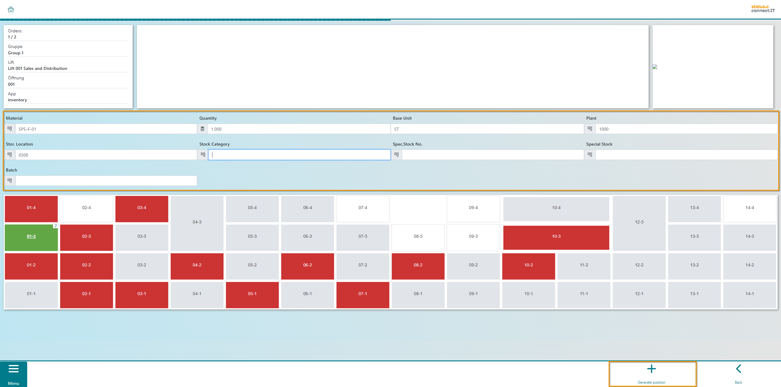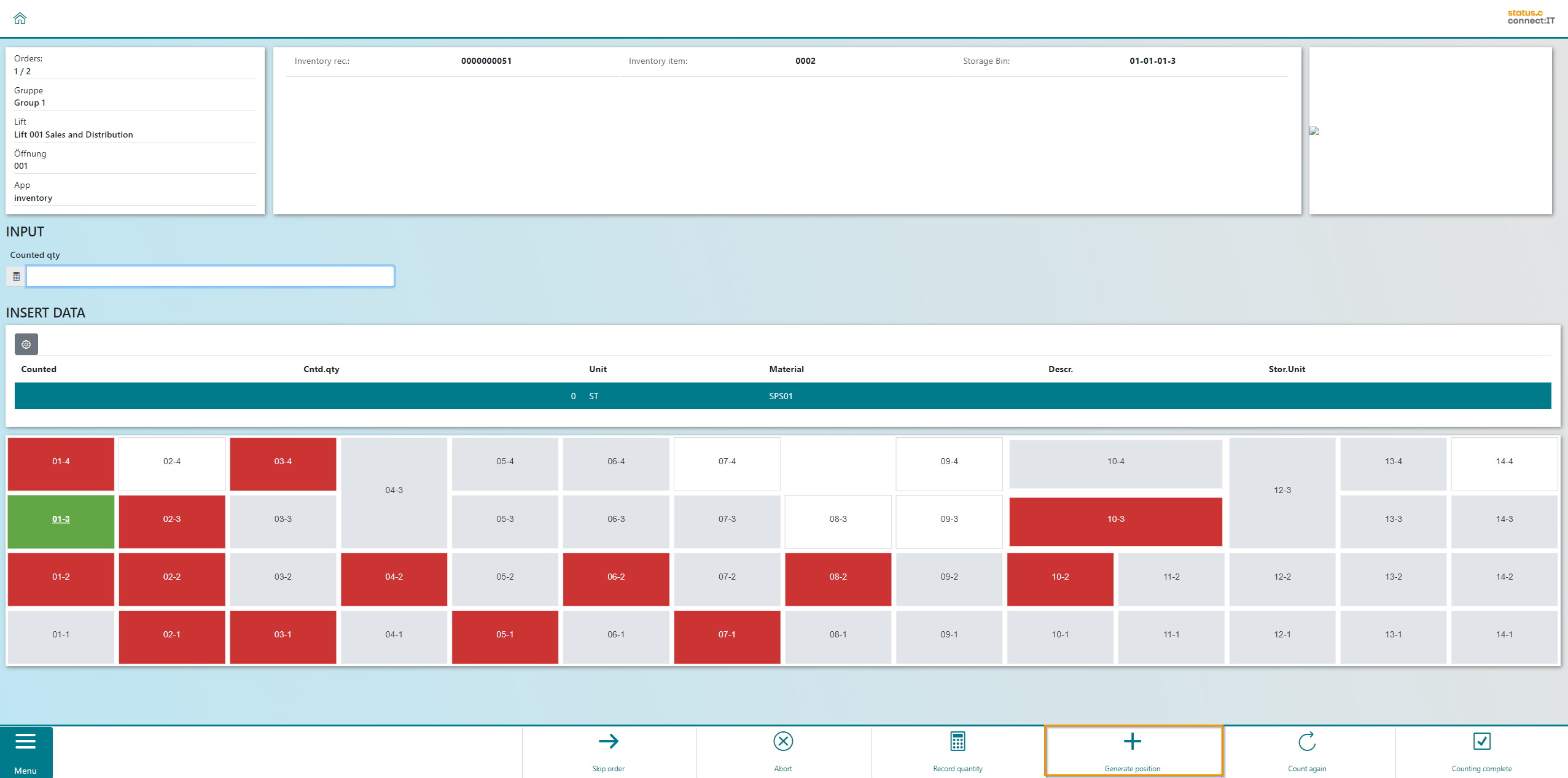 After entering the material, quantity, plant and storage location in the corresponding input fields the button "Generate position" will appear in the navigation bar. Selecting the button will create a new inventory counting position.