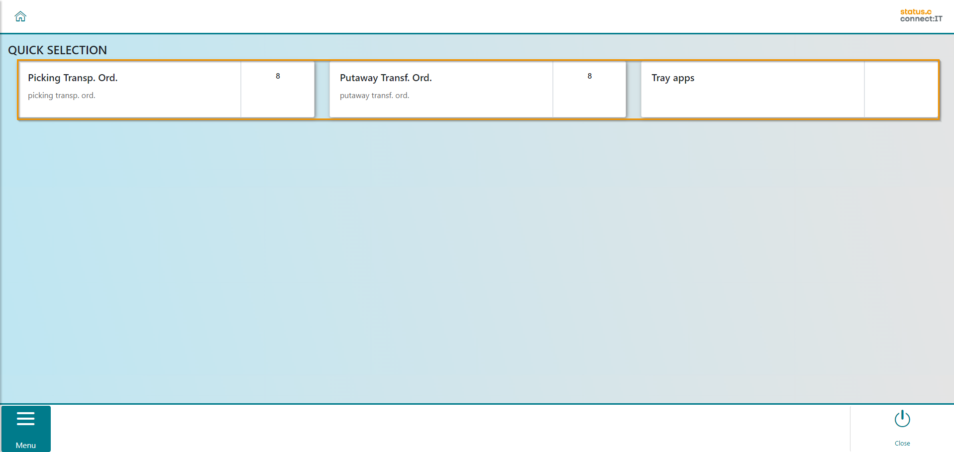 The functions of the Main Lift are comparable to those of a standard lift. If you click on the navigation menu at the bottom left, you can see the various functions that are available for the Main Lift: Guided Picking, Guided Putaway, Inventory, Tray Apps. Putaway, picking and inventory can also be carried out on the Main Lift for the Secondary Lift.