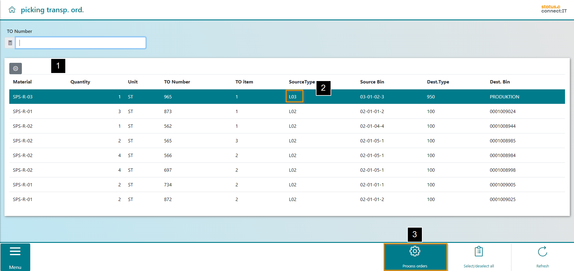 All transport orders in the worklist (1) that affect both the Main Lift and the Secondary Lift are displayed in the Main Lift under the picking transp. ord. function. The "SourceType" (2) indicates whether it is a stock removal from the Main or Secondary Lift. In this example, storage type L03 is assigned to the secondary lift. Therefore, the selected transport order should remove the material from the secondary lift. The transport order is sent to the secondary lift by "Process orders" (3). The order is completed for the Main Lift from this point on.