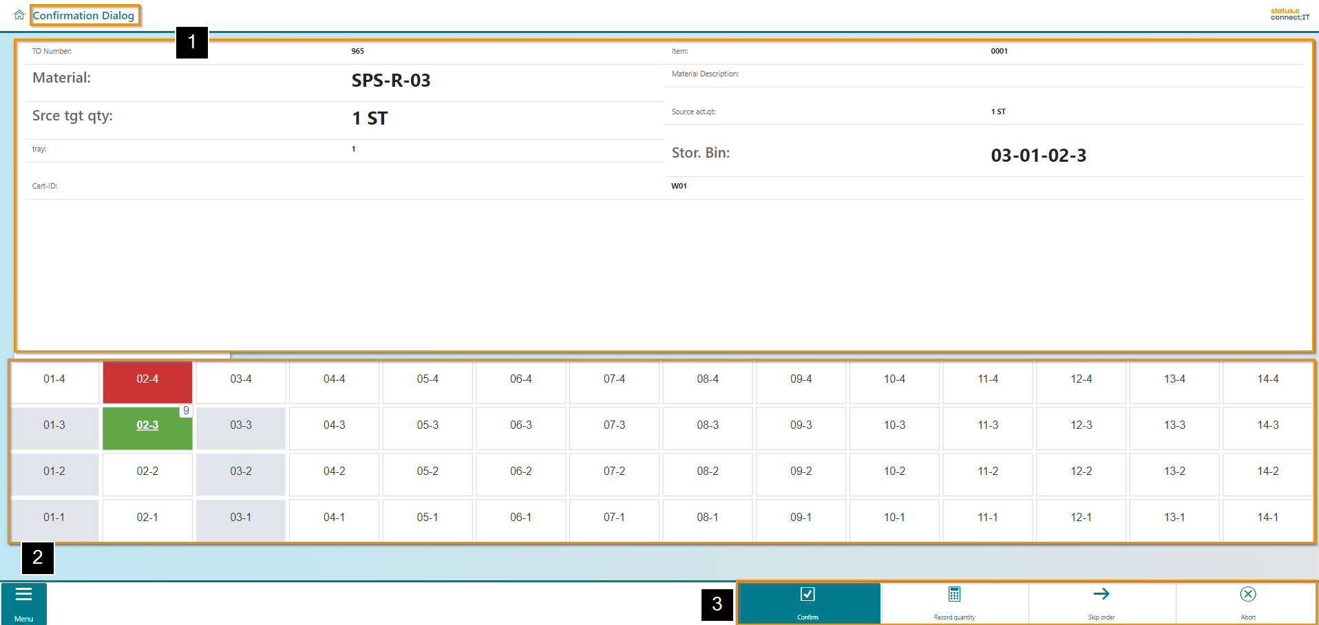The secondary lift reacts to the assigned transport order and moves the relevant tray to the removal opening. The tray from which the removal is to be made is now displayed in the confirmation dialog. The order details are displayed in the main field (1) and the corresponding tray is visualized (2). The buttons in the navigation bar (3) can be used to navigate through the process. The "Confirm" button confirms the removal and the transport order.