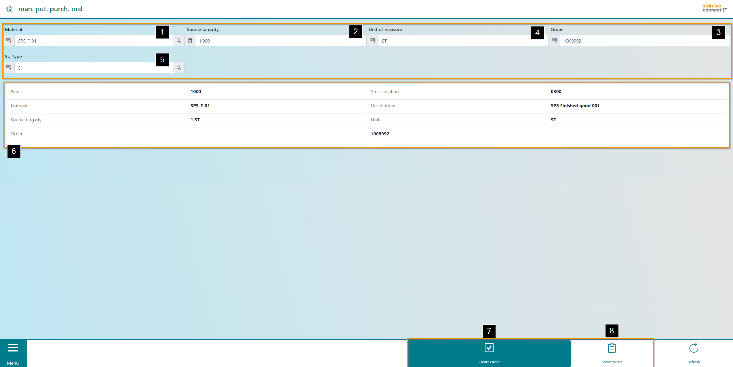 Four input fields are displayed in the main window. To create an order, the material (1), source target quantity (2) and order number (3) must be entered. The unit of measure (4) is taken from the material master. The storage unit type (5) (SU type) is also entered. If the data entered is correct, additional information is displayed in the middle of the screen (6) and the Create order button is displayed (7). Orders that have already been created can be viewed and processed using the Show orders button (8).