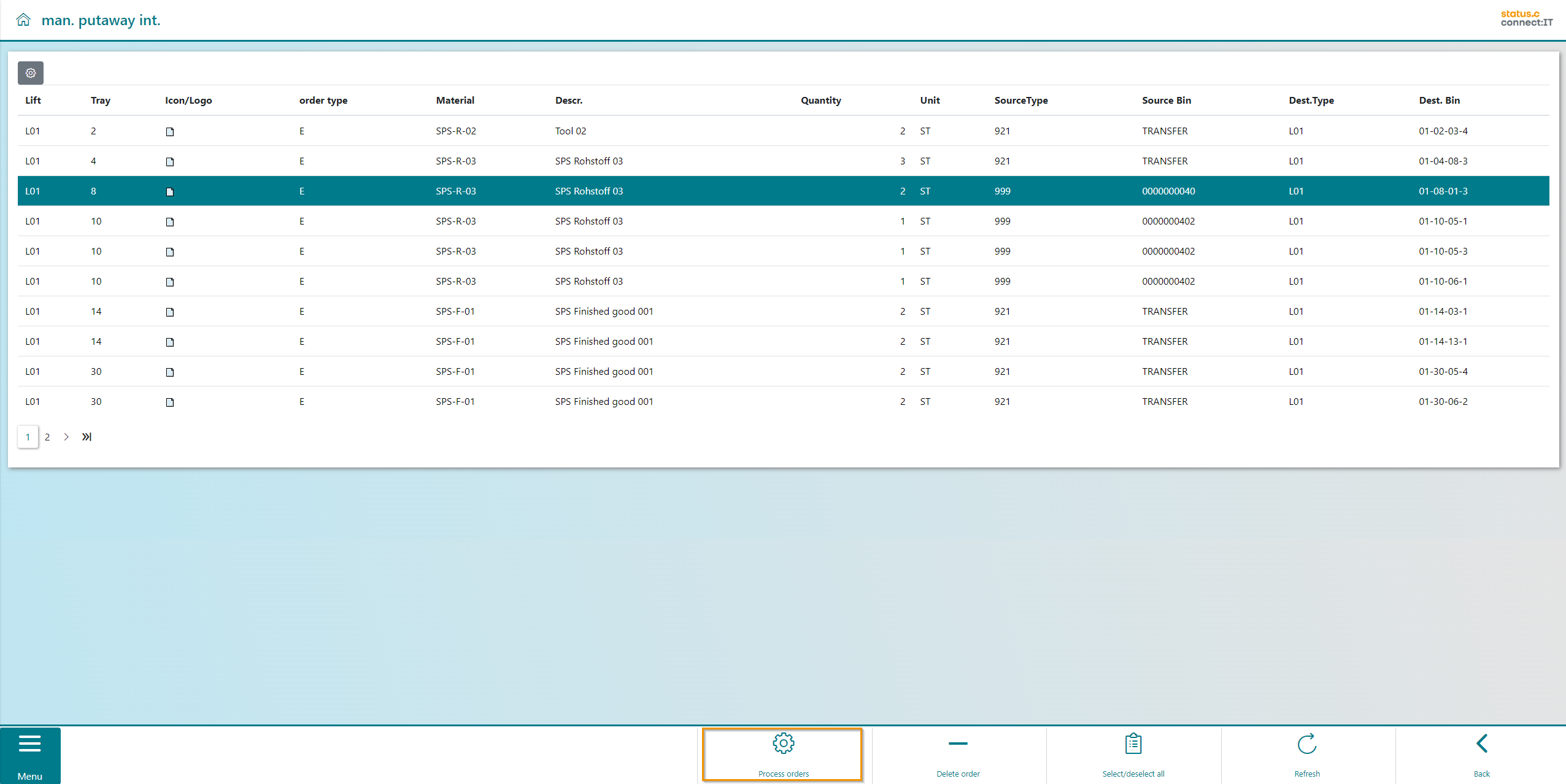 In the first picture of the process, the materials which are stored on the interface are displayed. By the selection of one or multiple lines and the confirmation by the confirm button, the user enters the palletization dialog. If more than one entry is selected, the materials are processed in sequence, before an order can be processed.