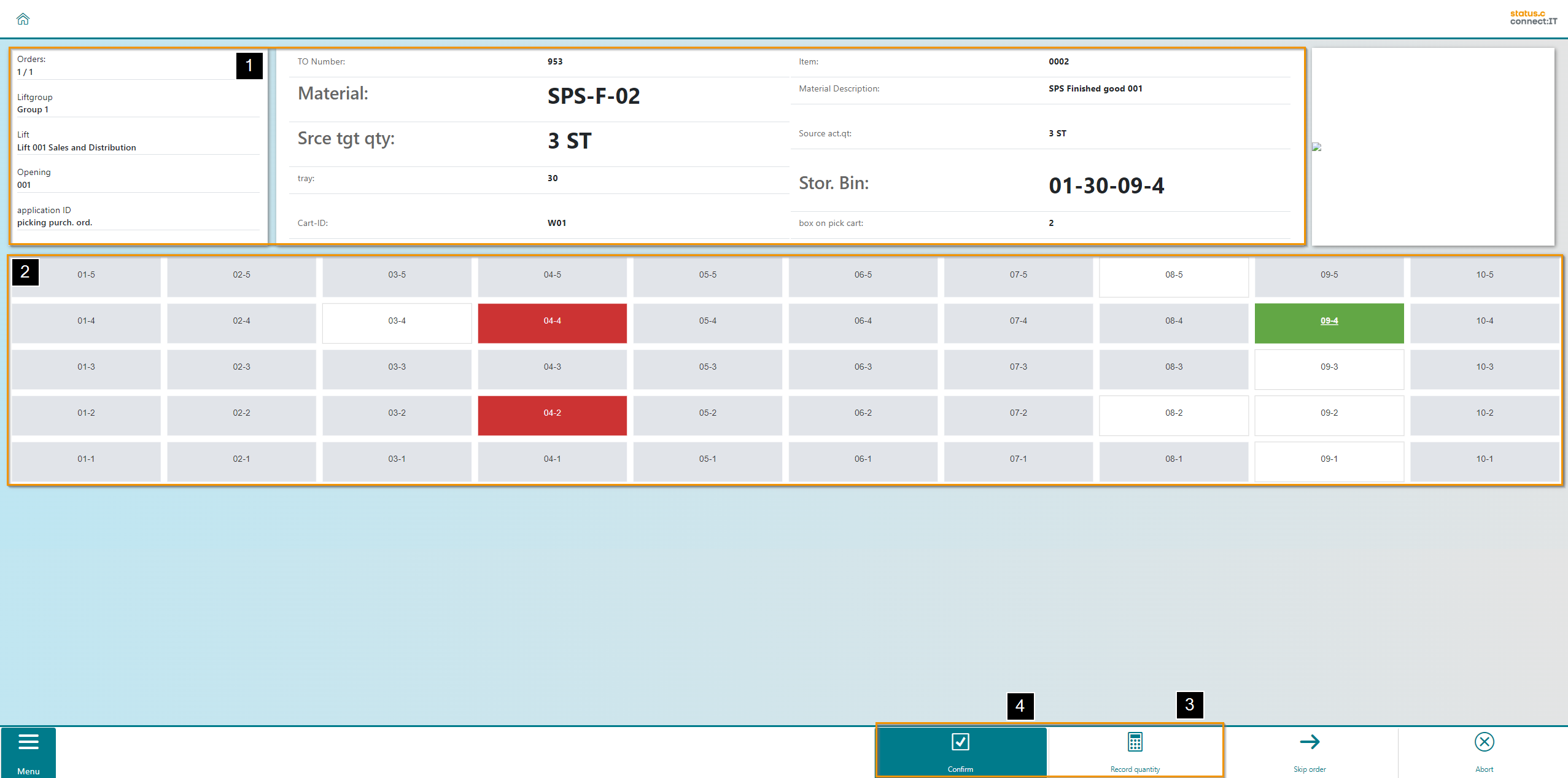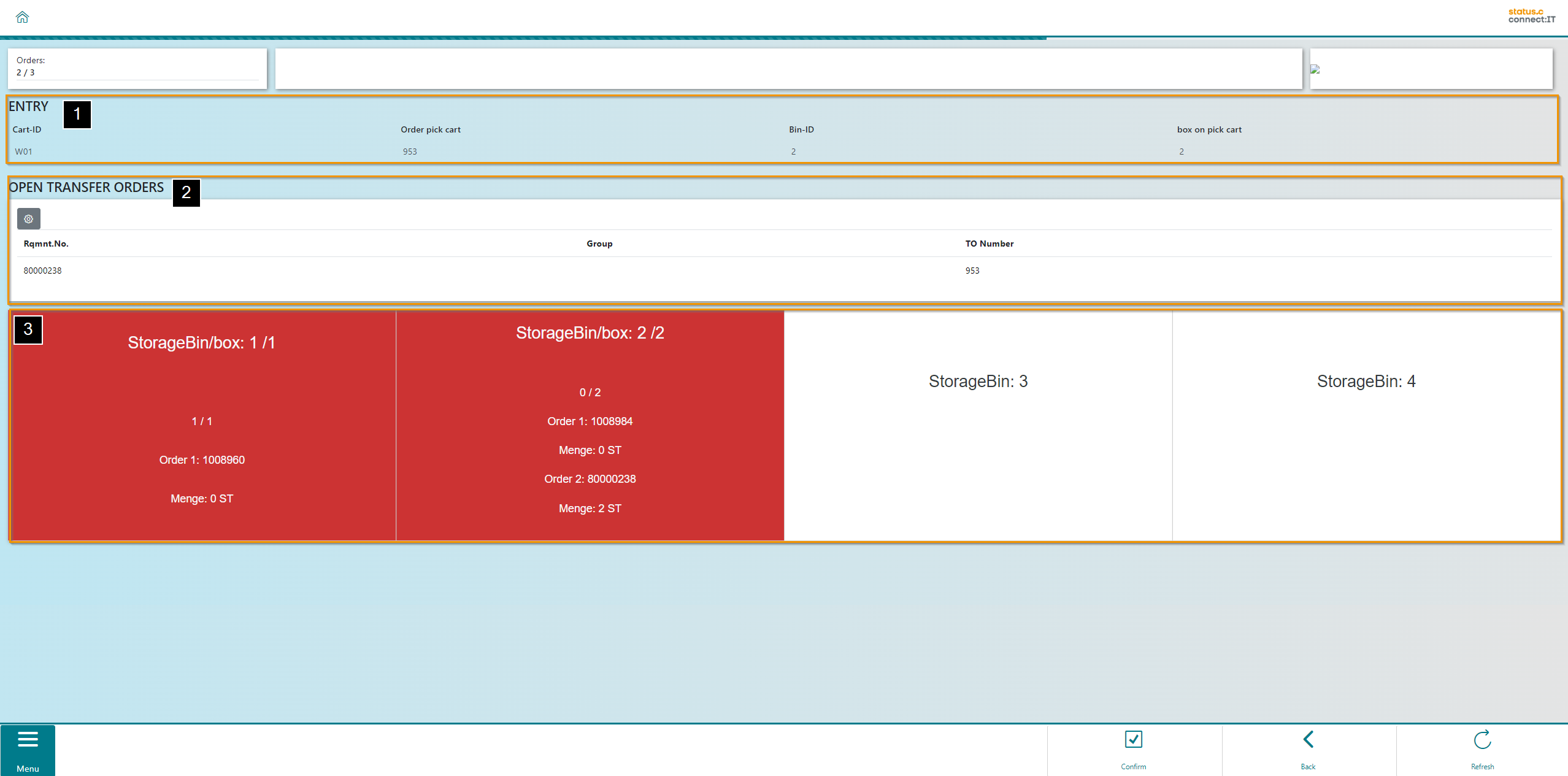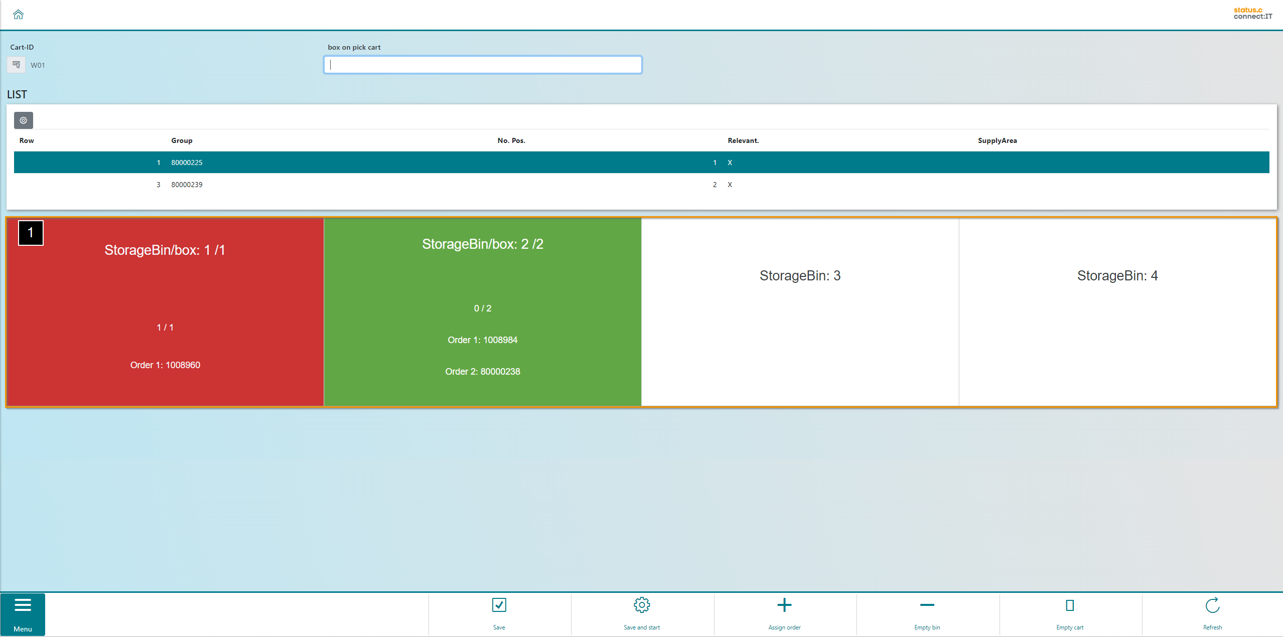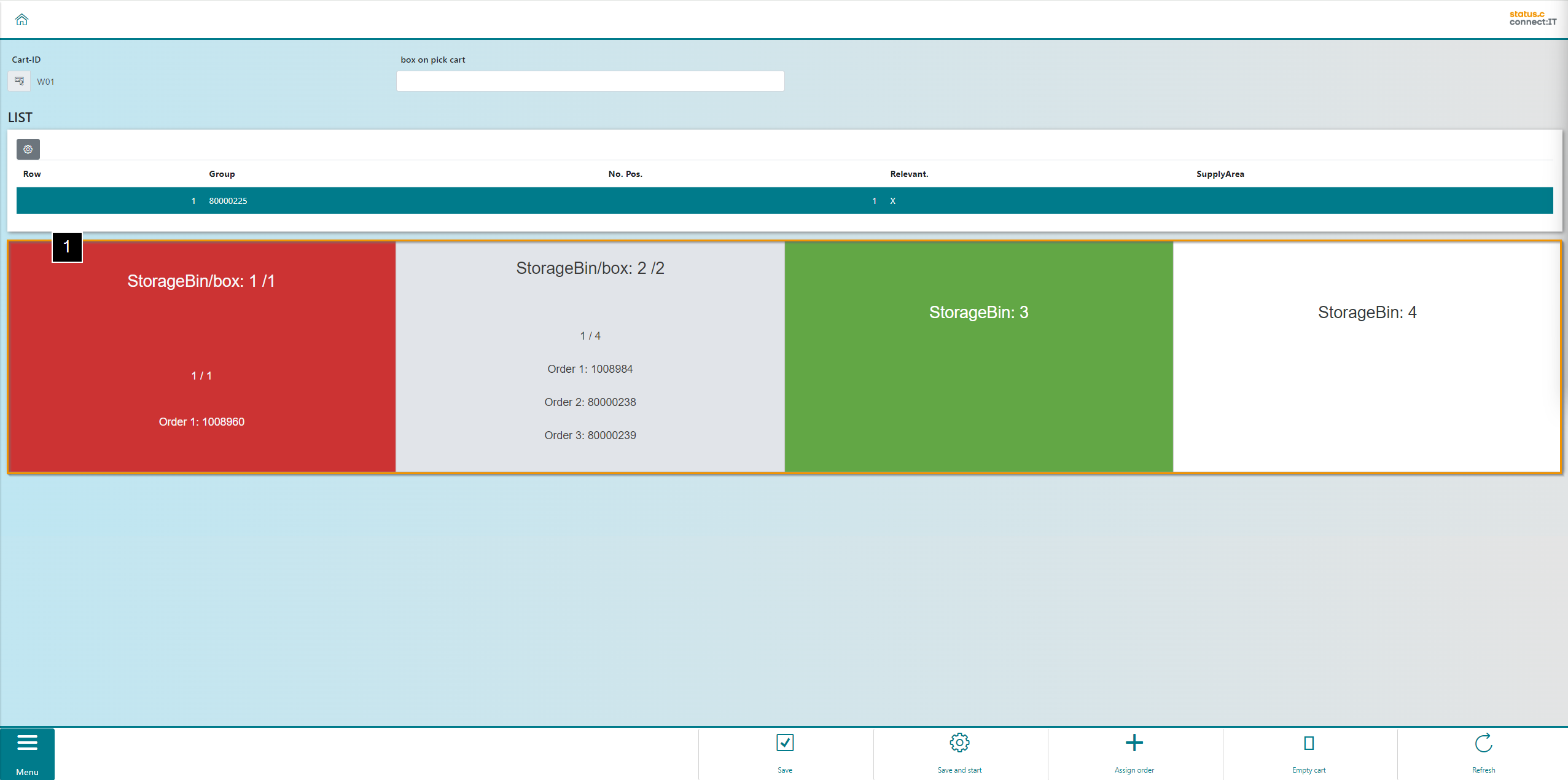 In the area for displaying the picking cart (1), the occupied spaces and the assigned orders are displayed. It is possible to assign more than one order to a bin. The number of positions assigned to each bin is also displayed.