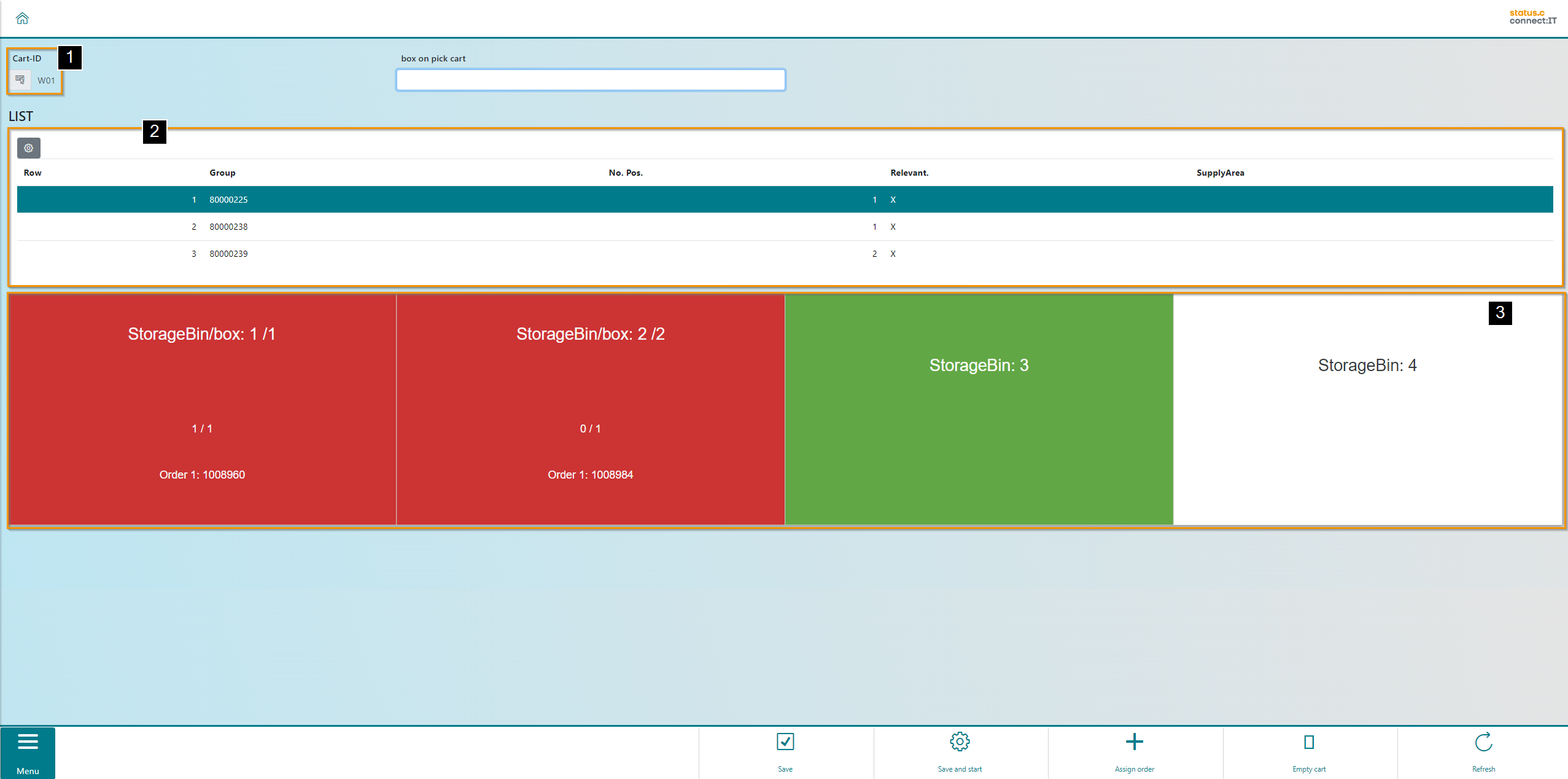 The ID of the currently selected cart is displayed in the header area (1). The cart number can be assigned to the workstation in customizing or entered freely by the user. The currently selected orders are displayed in the list area (2). These orders can now be assigned to the cart. In the bottom section of the screen (3), the current state of the picking cart is displayed.