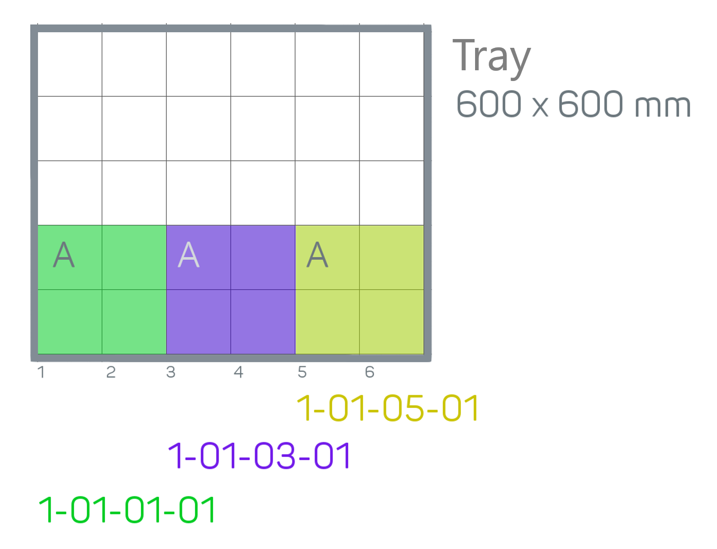 ![]() | Since the three bins are all on the same tray in the same lift (VLM), the first three numbers of the storage bins do not differ, since our storage bin template is L-TT-RR-PP. The X and Y coordinates (in the template R(X) and P(Y)) are of interest. The left lower bin usually starts with L-TT-01-01. This bin is of type A and therefore 200mm wide. Since the X-factor was determined to be 100mm, the next bin to the right does not begin with the coordinate L-TT-02-01 but with L-TT-03-01 (violet). And the yellow bin starts accordingly at L-TT-05-01. |