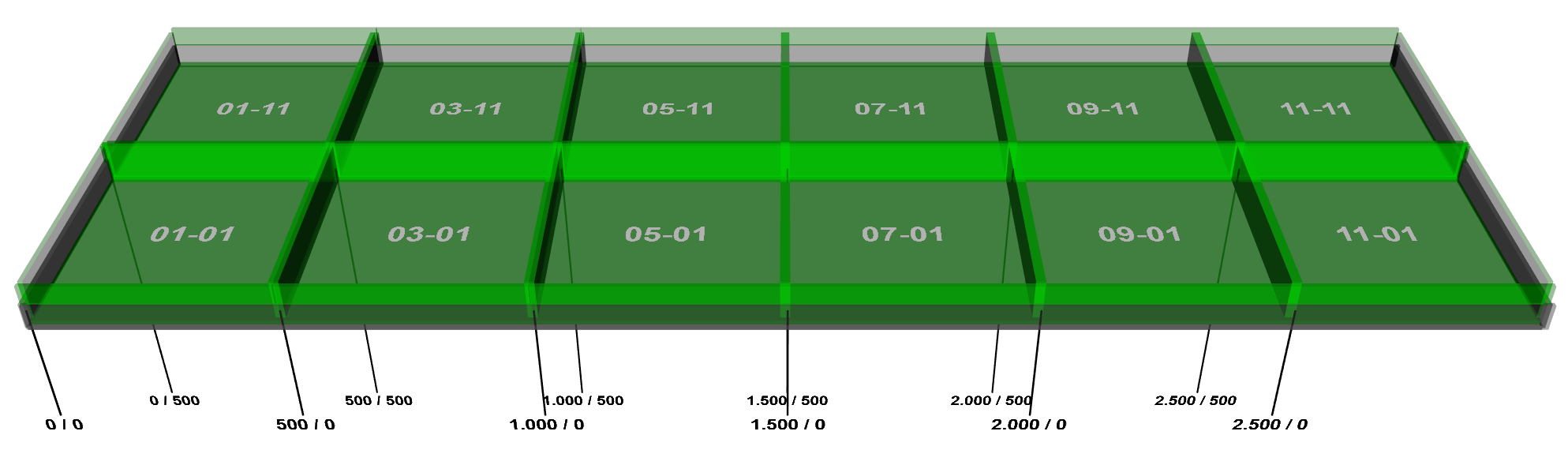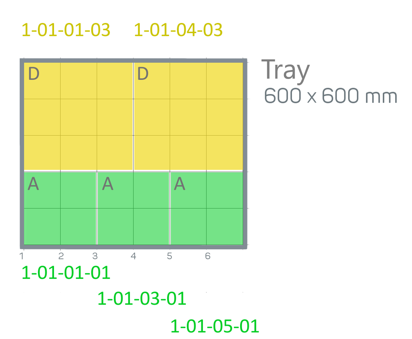 ![]() | Example of a mixed tray Tray: 3000x1000mm 2 x R1, 2 x G1, 26 x Y1 Change of coordinates both in X-direction and in Y-direction XX-YY Jumps in X-direction for Y1 only by one field in the grid, for R1 and G1 in X-direction jump by 2, as two grid positions are taken. |