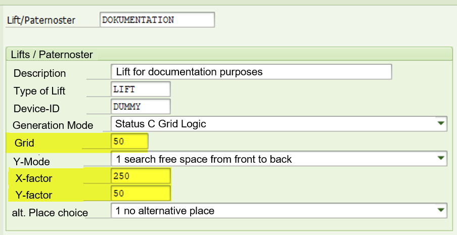 From Release 4.9, the following report can be used to calculate the values for grid, X and Y factor: /STC/TSK31_011 - Calculation of lift attributes. The requirement is that an IM or WM allocation exists for the lift and that the relevant dimensions have been maintained for the corresponding plant/storage location combination in table /STC/TSK15_T505 - Dimensions of bin types.