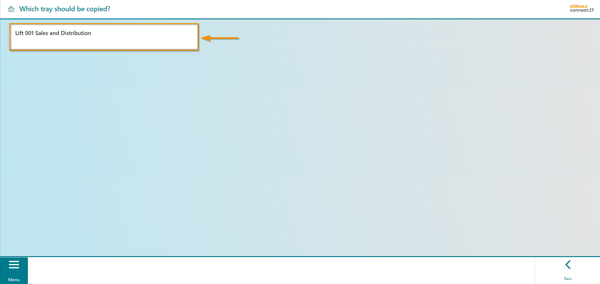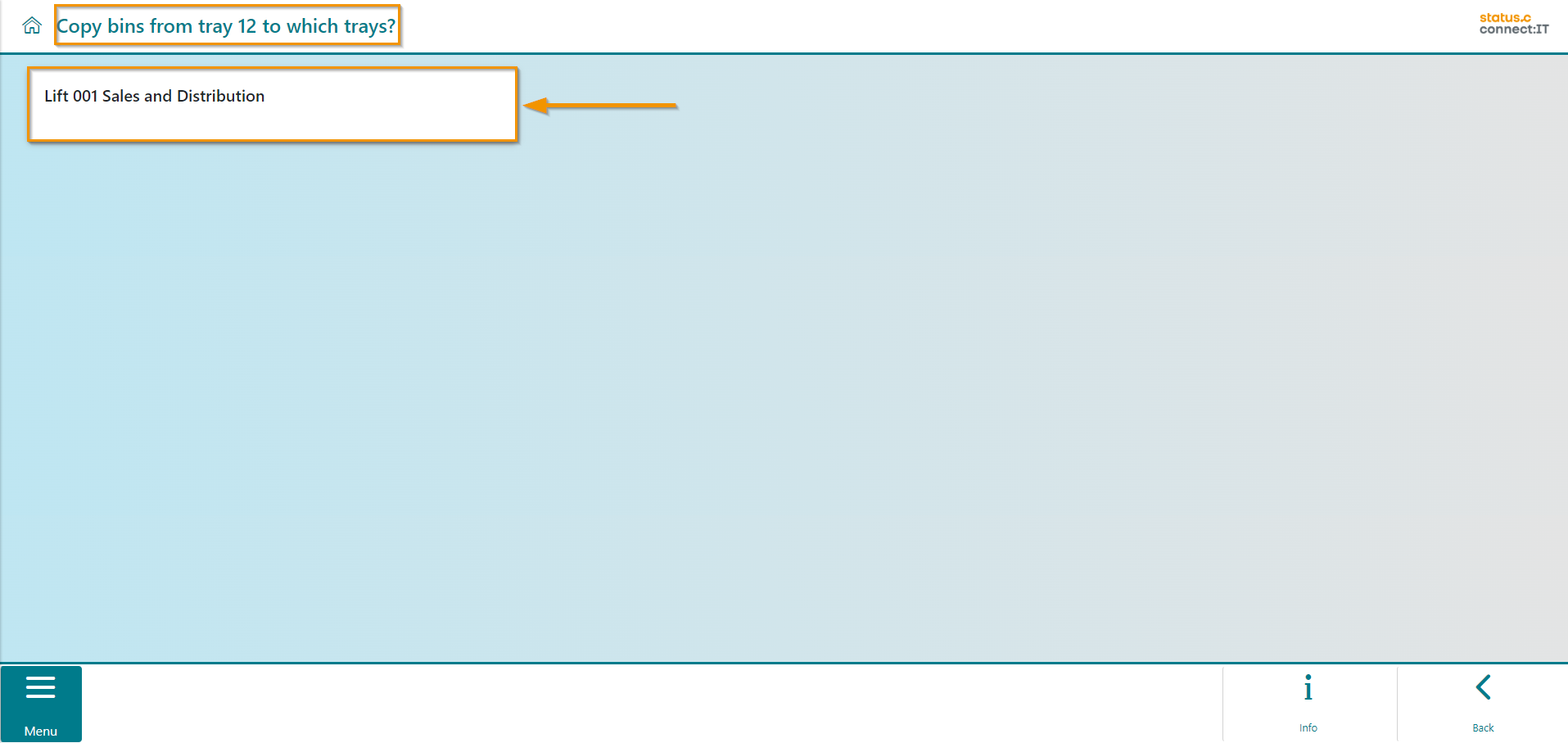 After confirmation, the user is asked which tray the copied bins should be transferred to. To do this, they must first select the lift.