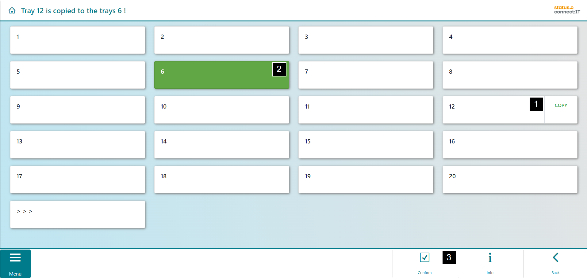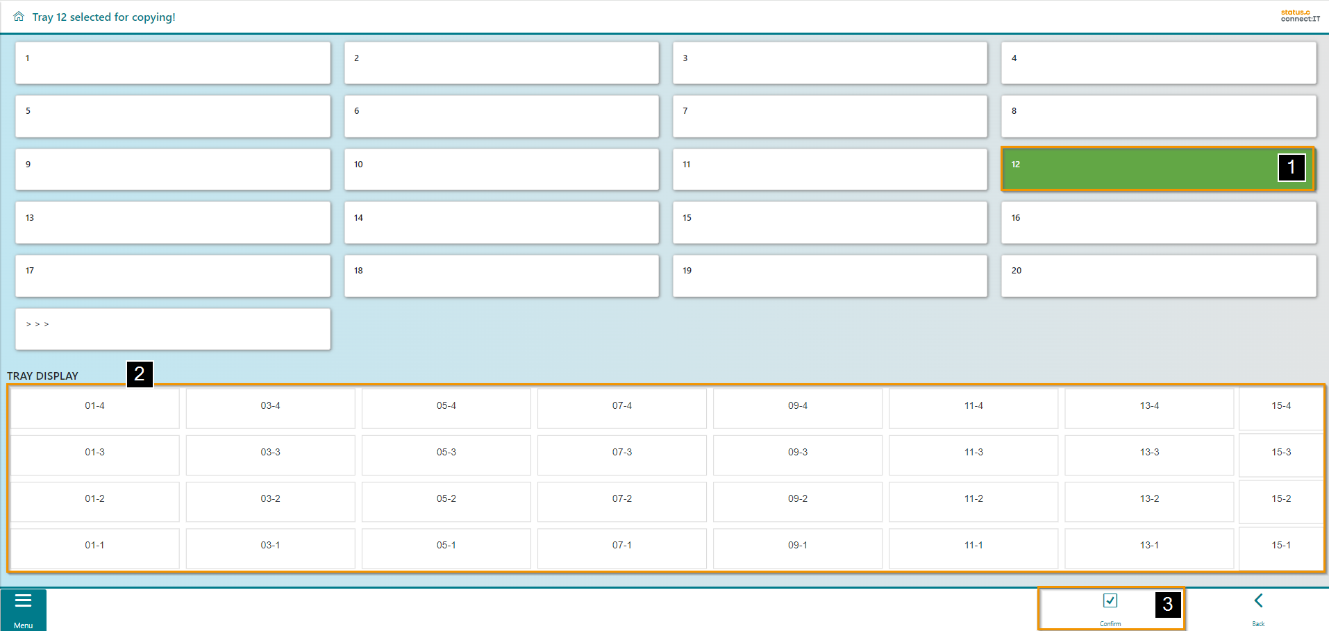 All trays of the lift are now displayed to the user. Tray 12 is selected in this example (1). A visualization of the bin locations appears in the middle of the screen (2). "Confirm" to copy the tray (3).