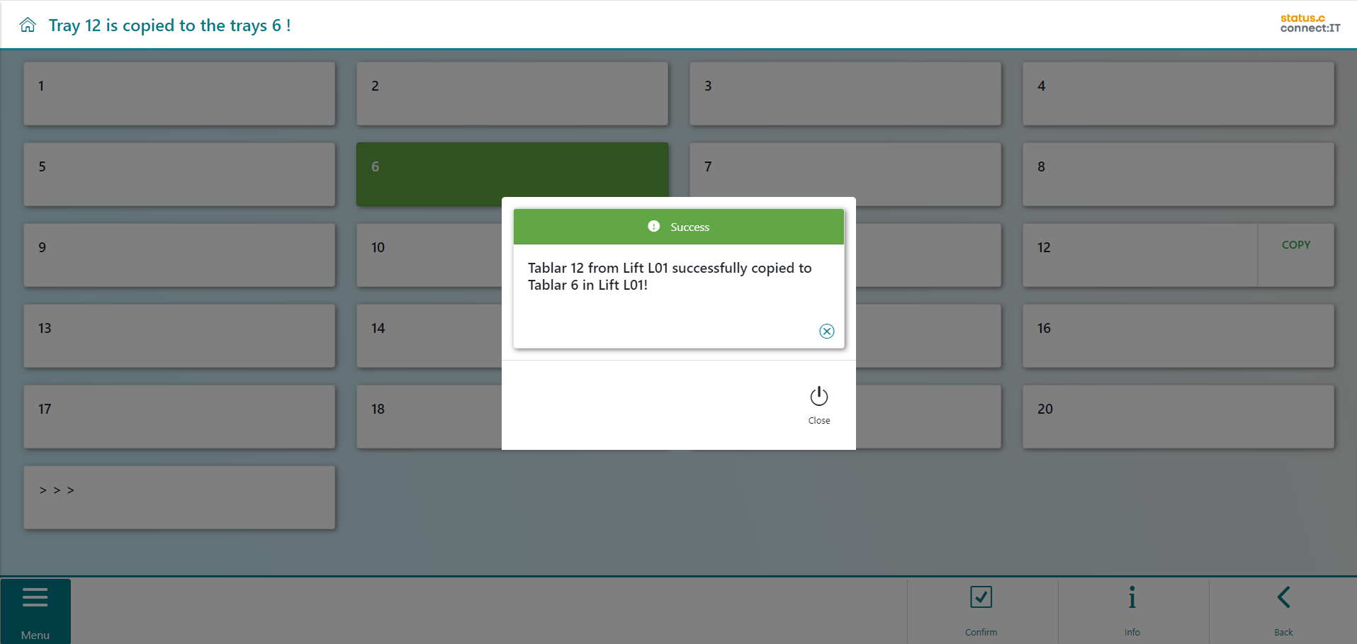 All trays of the lift are displayed to the user. Tray 12 is marked as the copy template (1). Next, select the tray to which the bins from tray 12 will be copied. It is possible to select several trays. In the example, tray 6 is selected (2). Click on "Confirm"(3) to create tray 6 from the template of tray 12.