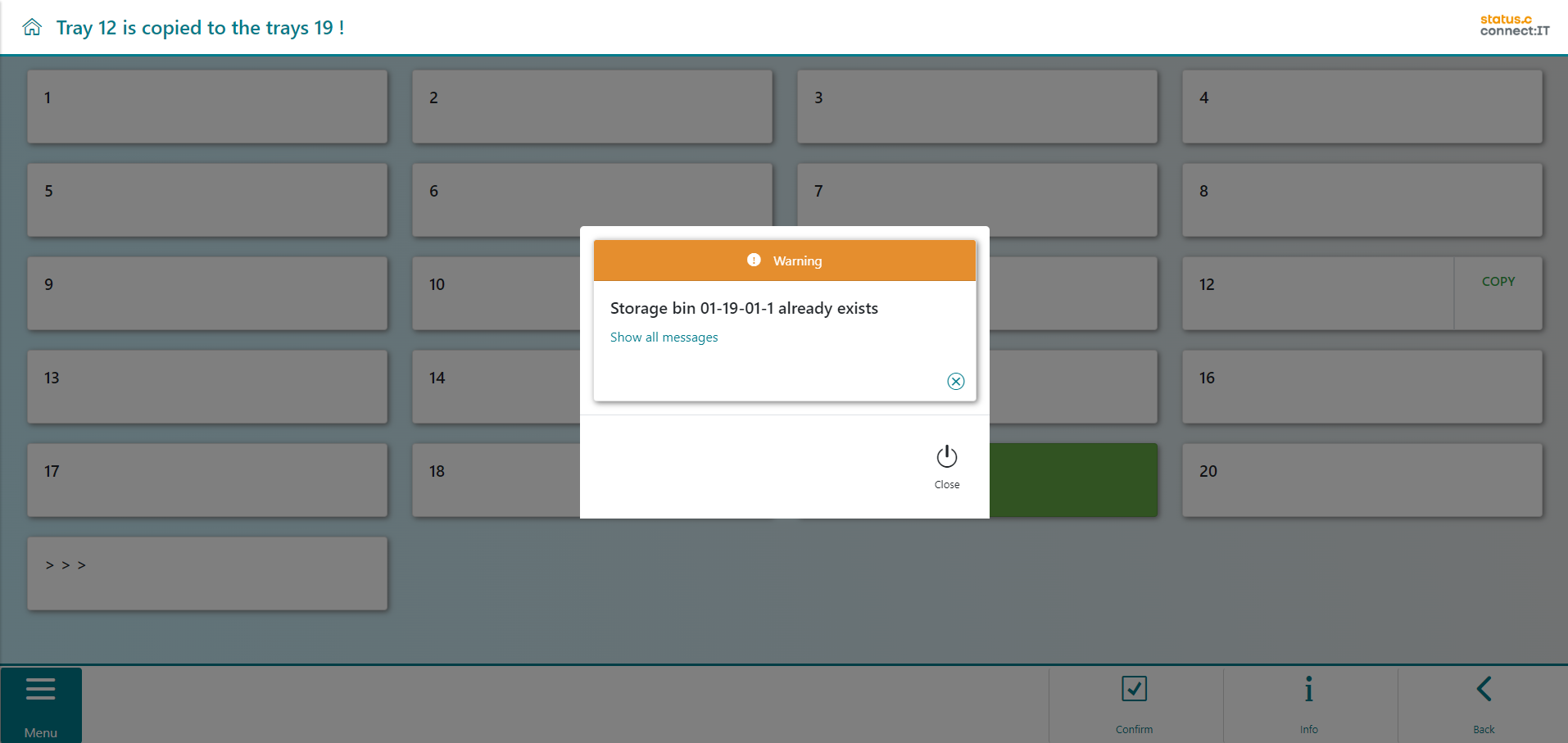 If a tray is chosen, and it contains bins where bins already exist in the copy template, an error message will be displayed. In the example, a copy is to be made to tray 19. However, storage bins already exist there.