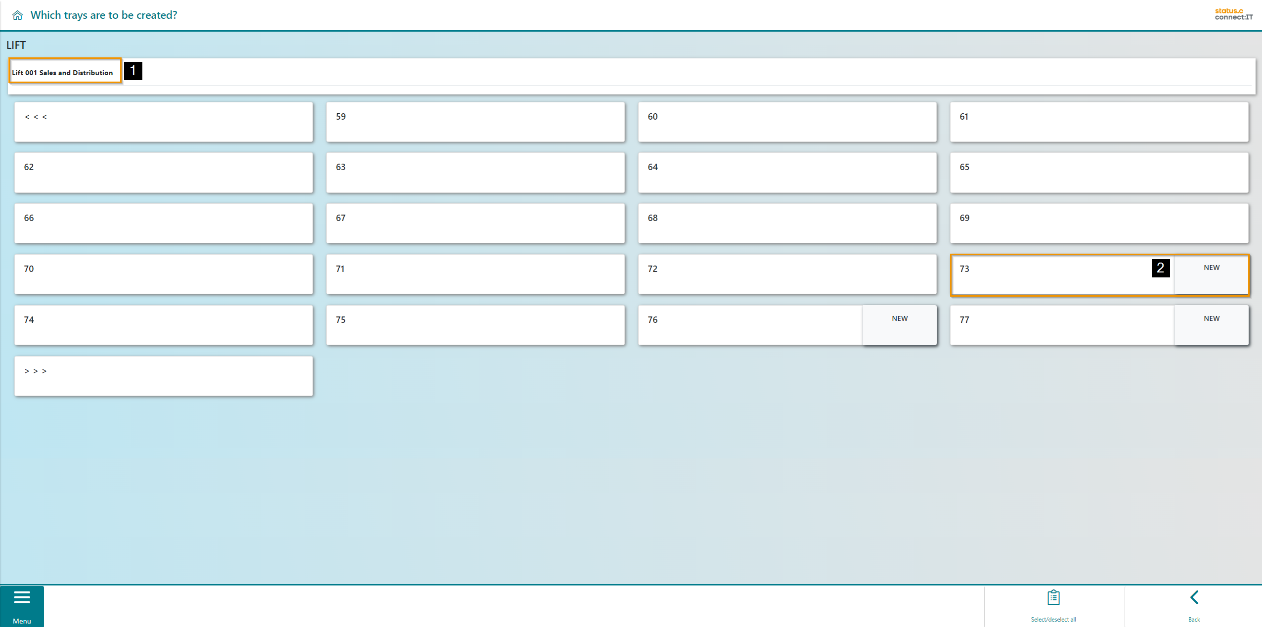 The trays of the respective lift (1) are now displayed here. Trays 1-72 have already been created. Tray 73 is the first available new tray. Available trays can be recognized by the label "NEW".