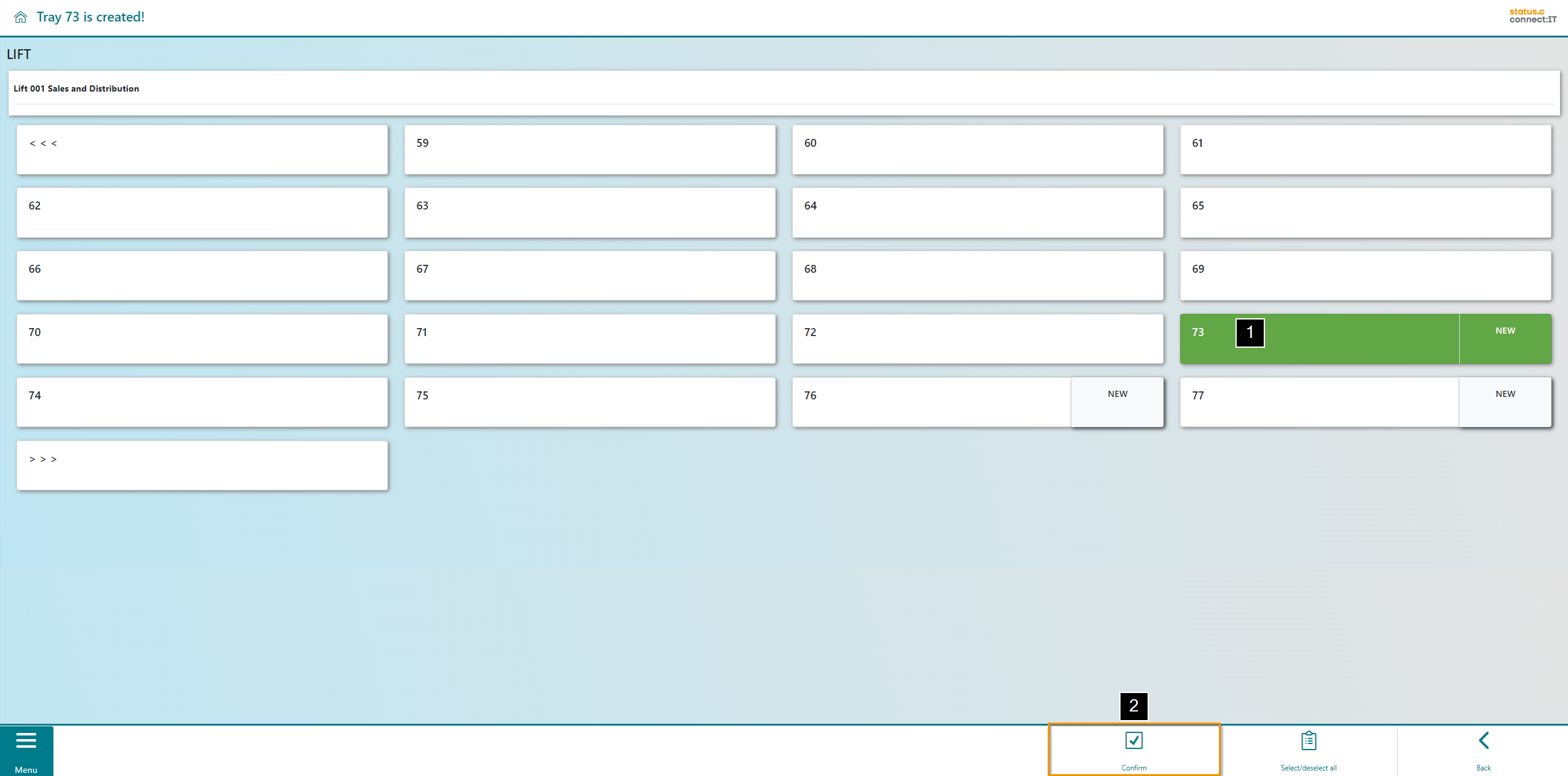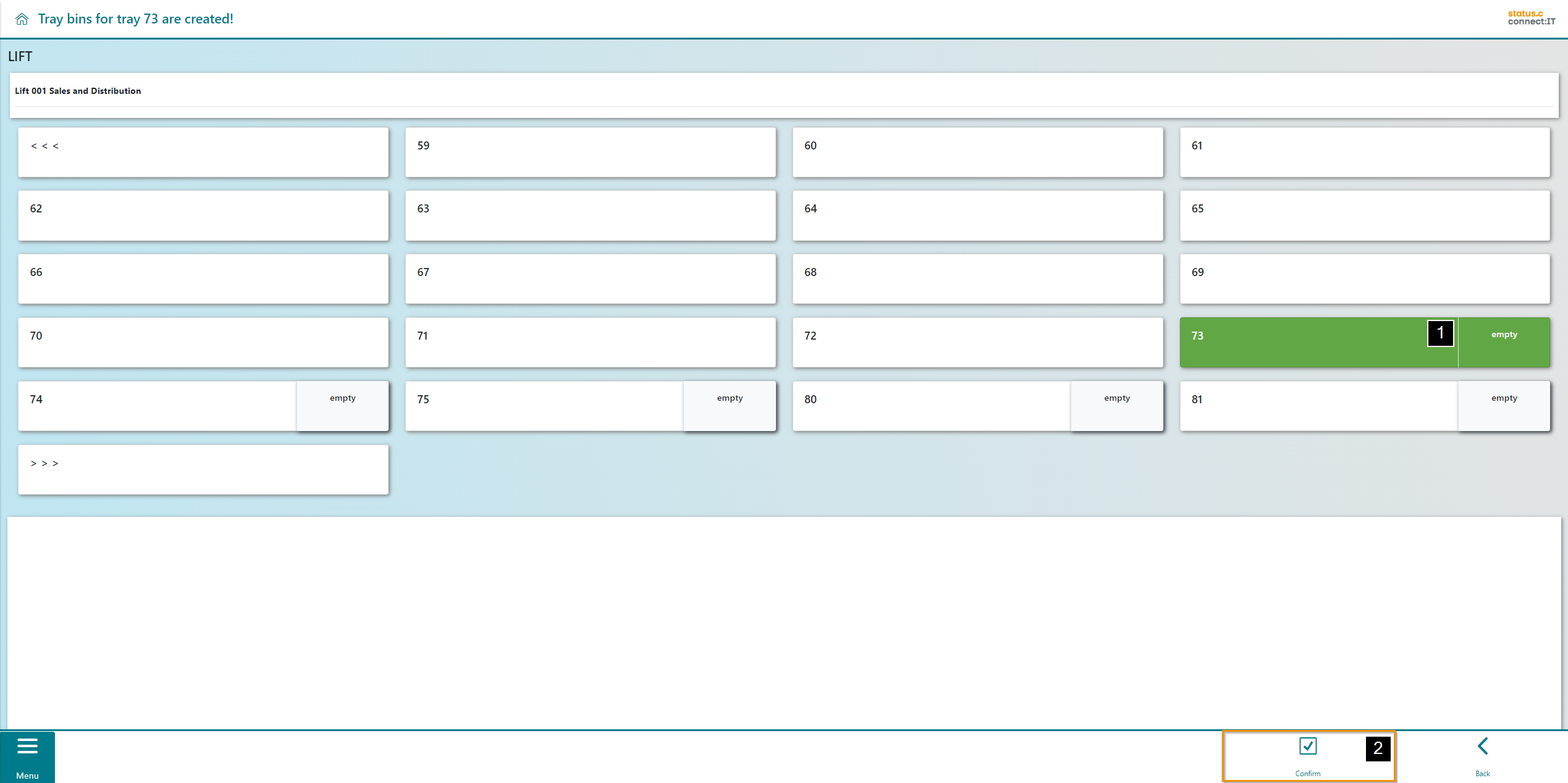 The user is now shown the trays in the lift. Trays that do not yet contain any bins are marked with an "EMPTY". In this example tray 73 is shown as empty (1). Select an empty tray and proceed by confirming (2).