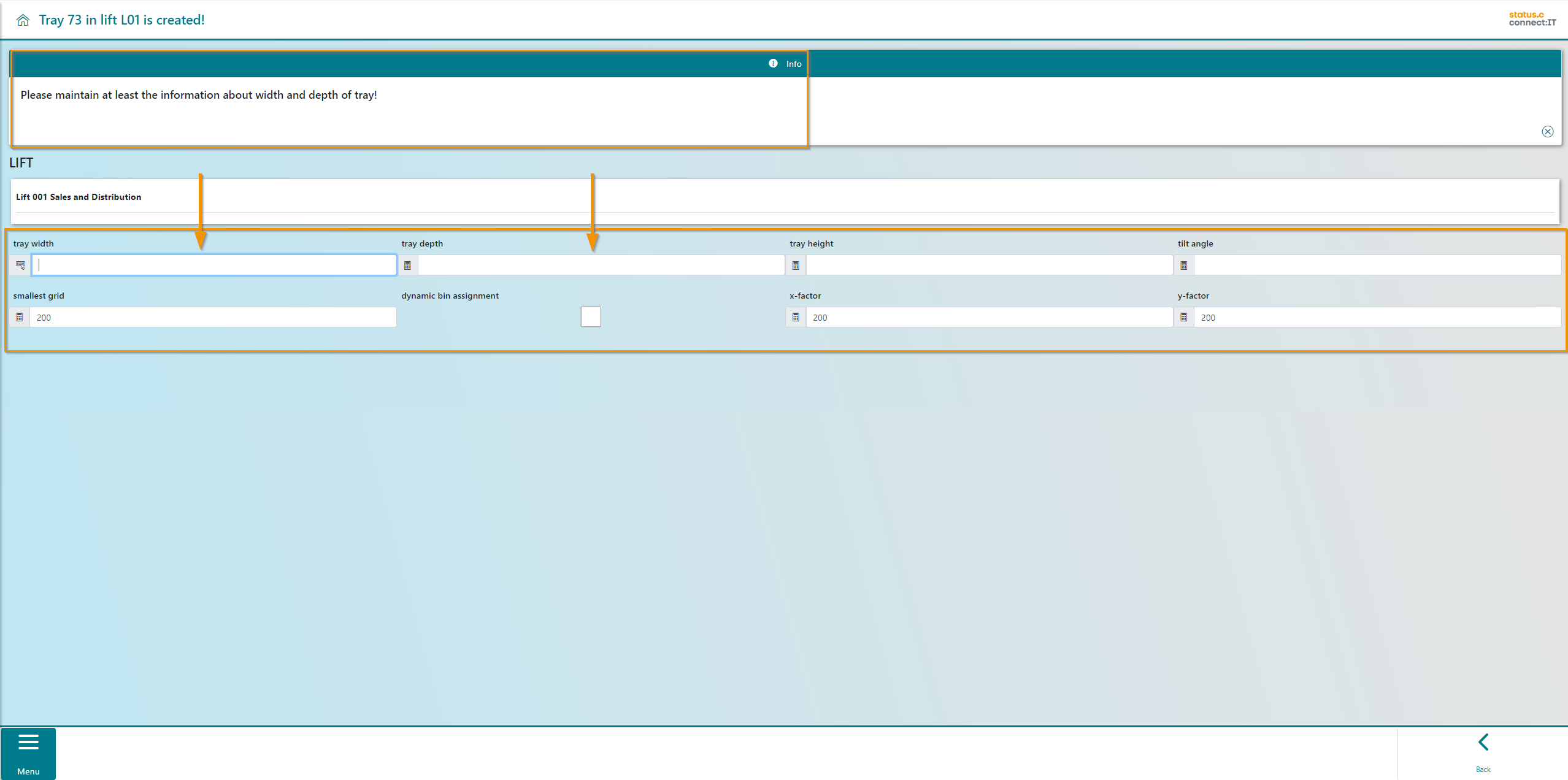 On the next screen, the user is asked to maintain the dimensions of the tray. At least the width and depth should be entered.