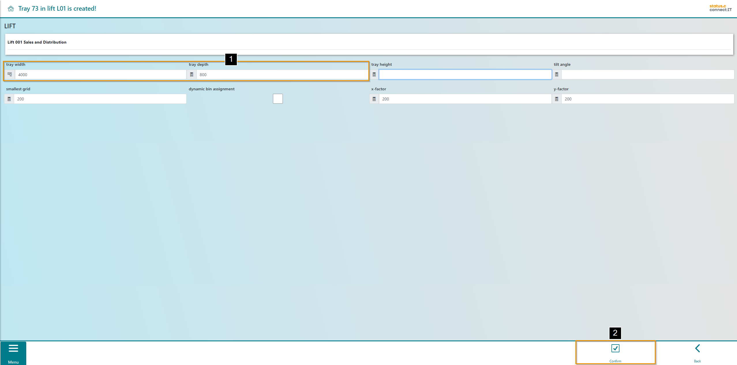 As soon as the width and depth have been input and confirmed with Enter (1), the "Confirm" button appears for the user to select (2).