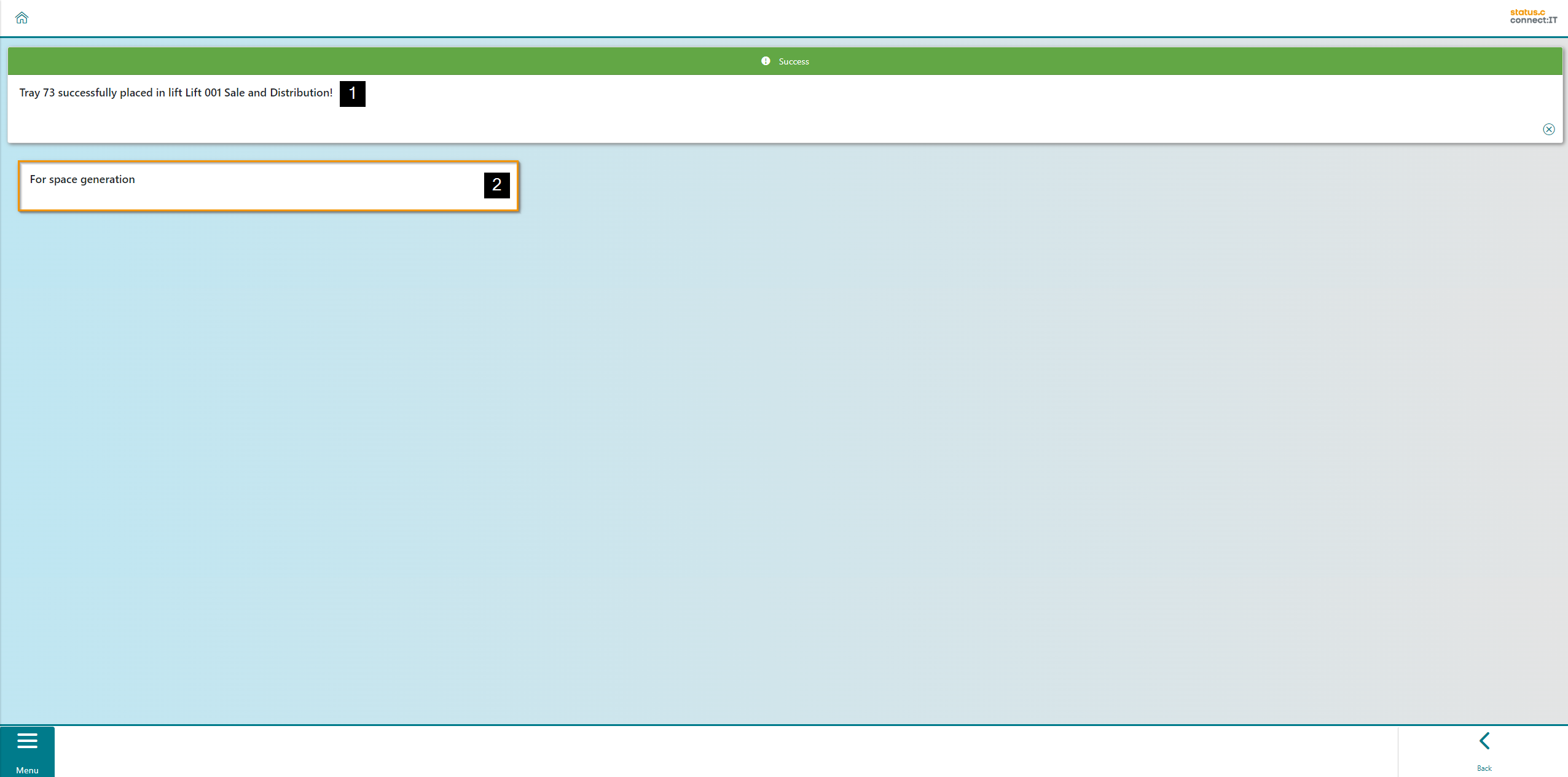 After confirming, a success message for the created tray is displayed (1). The user is now offered the option of generating space/bins for the tray that has just been created (2). The Generate spaces app can also be called up directly from the main menu.