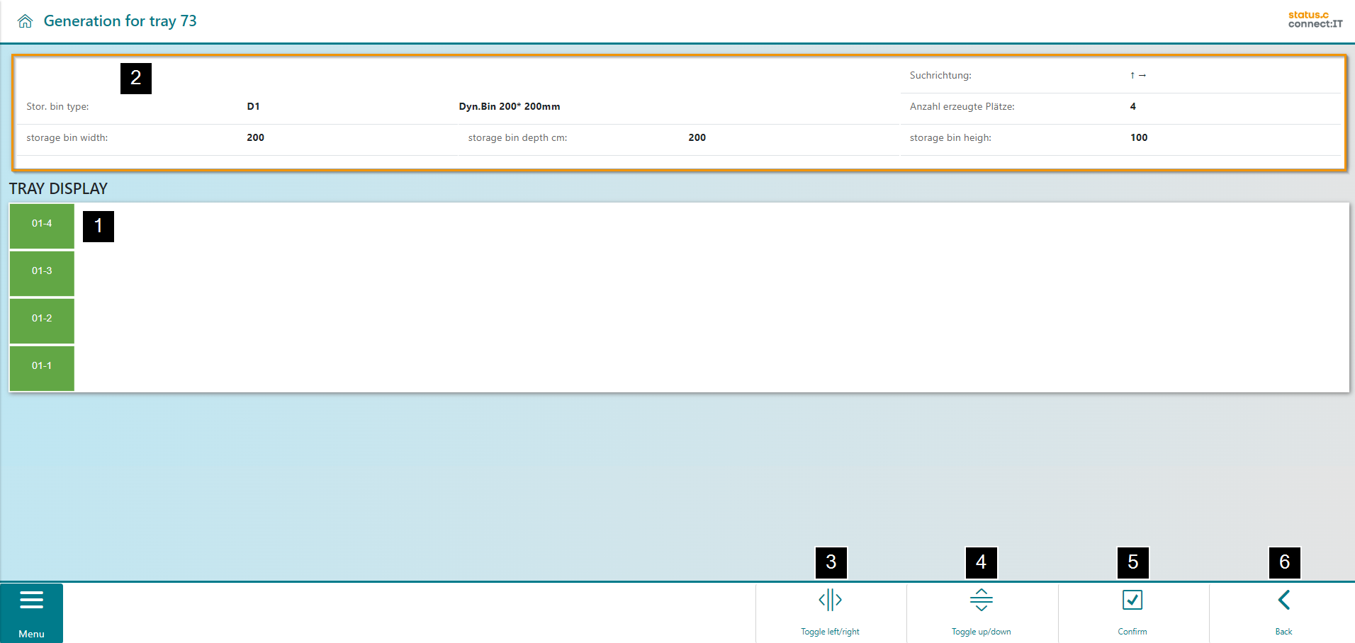 In the navigation bar, the bins can still be adjusted with regard to the side (3) and the direction (4) (not relevant in this case as the column is fully filled). If the bins are in the correct position, the creation can be saved with Confirm (5). With Back, the user can return to the bin type selection and the visualized column is discarded (6).