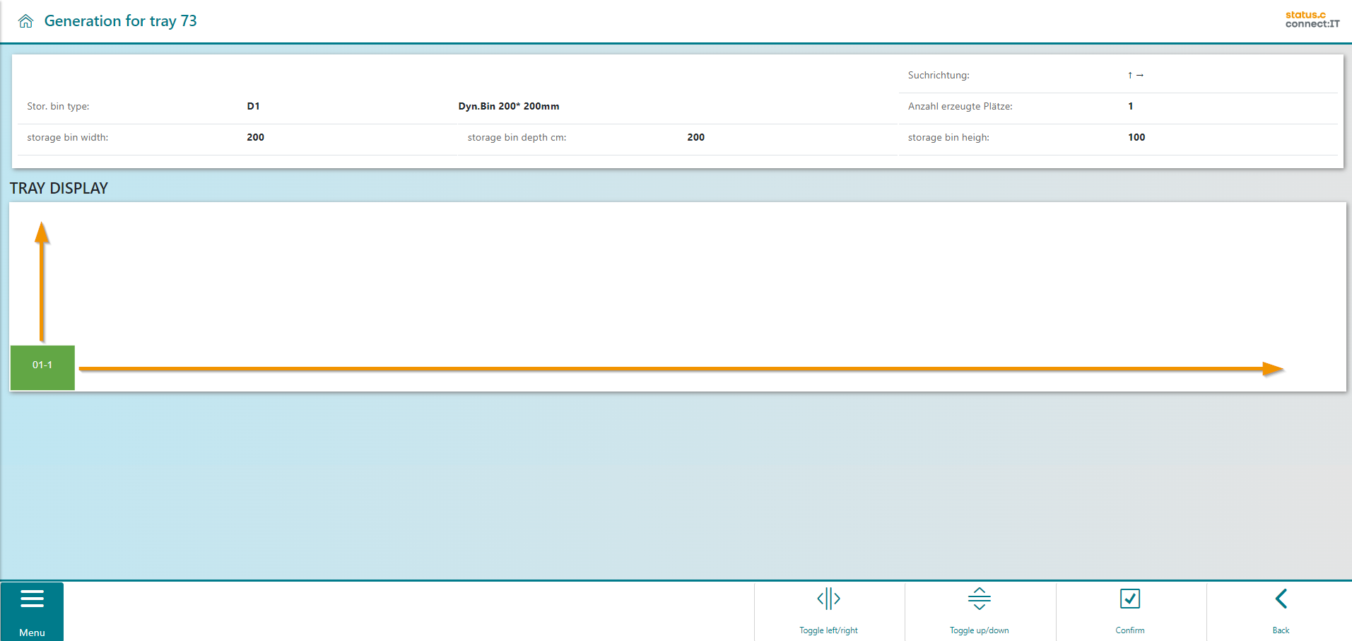 With the "single bin generation", exactly one space is displayed on the tray. The space can still be repositioned using the buttons.