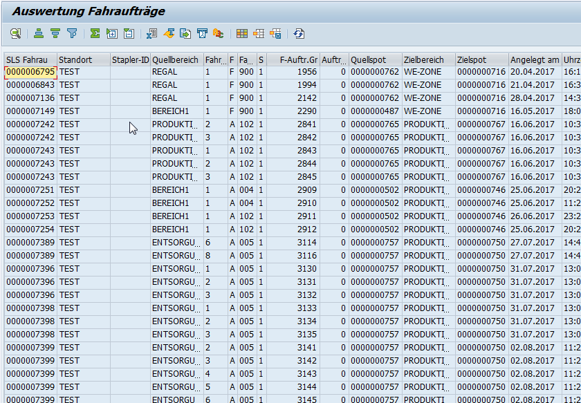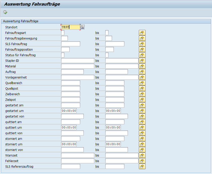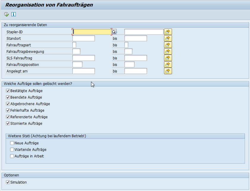 Um Fahraufträge zu löschen, da sie zum Beispiel fälschlicherweise angelegt wurden, starten Sie die Transaktion SE38 und geben Sie den Report /STC/TSK33_ERP_REORG_DRCMD in das Eingabefeld ein. Diese Funktion ist nicht über eine eigene Transaktion verfügbar, da man wissen muss, was man tut um Inkonsistenzen im Staplerleitsystem zu vermeiden. Sie können auch mit diesem Report alte Fahraufträge löschen, damit die Datenbanktabelle nicht zu groß wird.