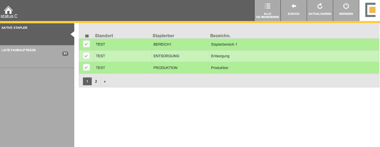 | Über "Alle de-/markieren" werden alle Einträge aus den Staplerbereichen selektiert bzw. die Selektion wird aufgehoben. |